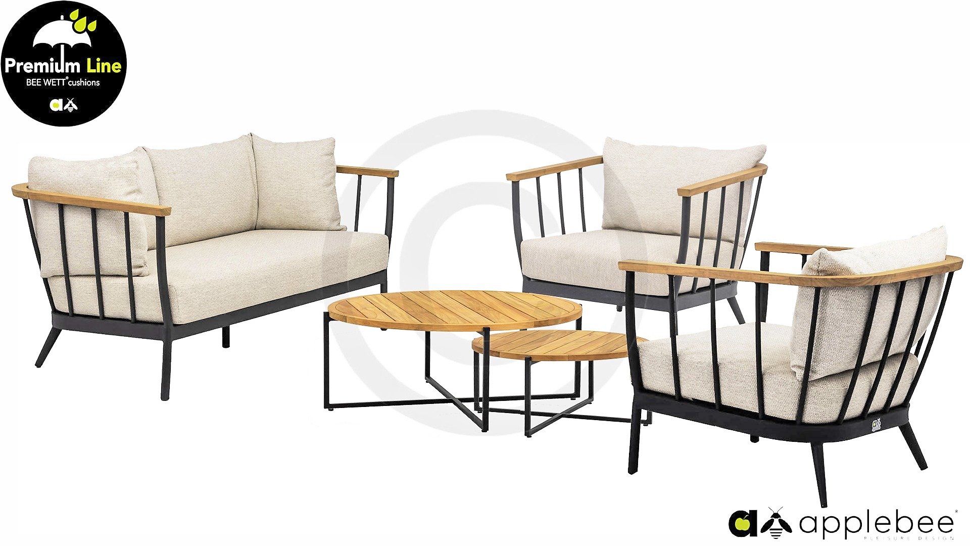 Die Apple Bee Condor Lounge Black ein klares, robustes Aussehen. Das Grundmaterial besteht aus pulverbeschichtetem matt-schwarzem Aluminium. Die BEE WETT® Kissen haben eine grobe Webstruktur, aber mit einem weichen Griff. Die schönen Rundungen im Rücken und der Einsatz von naturbelassenem Teakholz in den Armlehnen verleihen dem Condor eine angenehme natürliche Wärme.