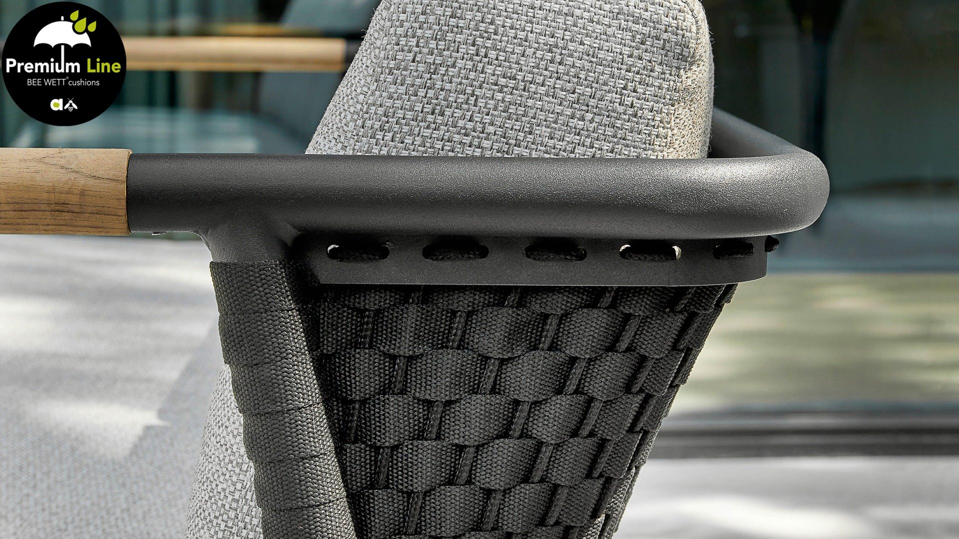 Durch die cleveren Linienführung wirkt dieses Apple Bee Elle Belt lounge set schlank, bietet aber dennoch viel Sitzplatz. Der runde mattschwarze Aluminiumrohrrahmen wird durch eine naturbelassene Teakholzarmlehne aufgelockert. Die Rückenlehne ist mit einem soliden geflochtenen schwarzfarbenen Gurt versehen, der das Rückenkissen an den Ecken gewissermaßen umschließt.