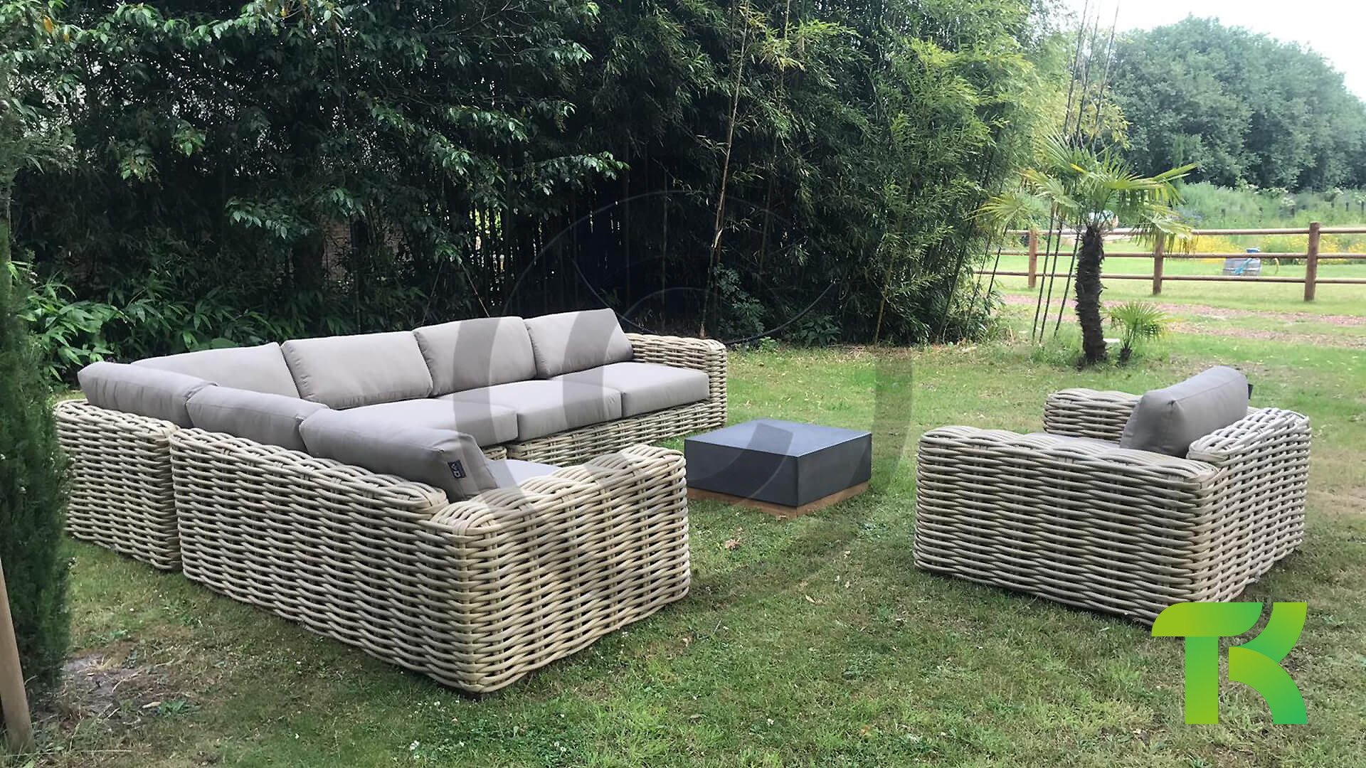 Die Apple Bee FFF Lounge ist großzügig geschnitten und beeindruckend: Die Sitzfläche ist fast einen Meter tief und das Geflecht aus 20 mm dickem Draht ist besonders voluminös! Dieses außergewöhnlich dicke Geflecht erfordert eine spezielle Flechttechnik, die nur von den besten Flechtern beherrscht wird. Diese Profis flechten jeden Strang einzeln von Hand. Dank der Stützkonstruktion lässt sich eine Seite der Lounge-Garnitur verlängern oder als separates Sitzelement nutzen.