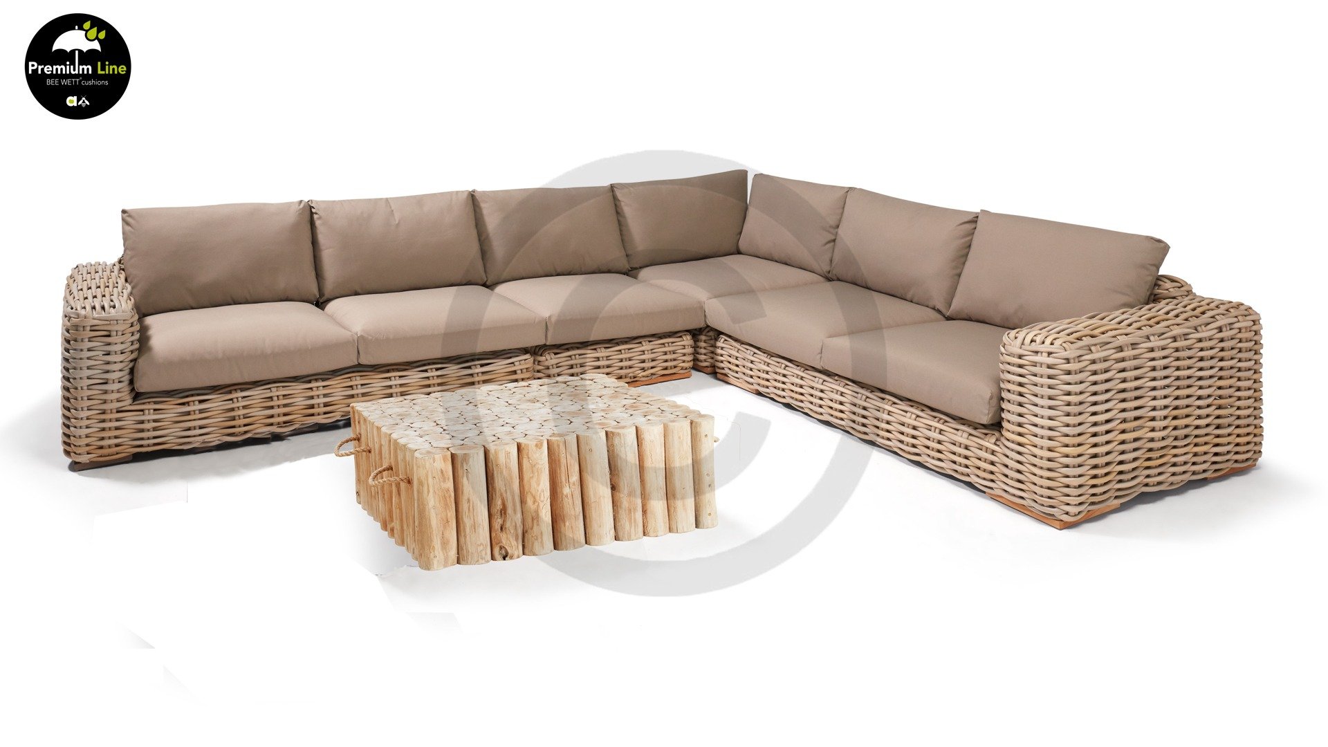 Die Apple Bee FFF Lounge ist großzügig geschnitten und beeindruckend: Die Sitzfläche ist fast einen Meter tief und das Geflecht aus 20 mm dickem Draht ist besonders voluminös! Dieses außergewöhnlich dicke Geflecht erfordert eine spezielle Flechttechnik, die nur von den besten Flechtern beherrscht wird. Diese Profis flechten jeden Strang einzeln von Hand. Dank der Stützkonstruktion lässt sich eine Seite der Lounge-Garnitur verlängern oder als separates Sitzelement nutzen.