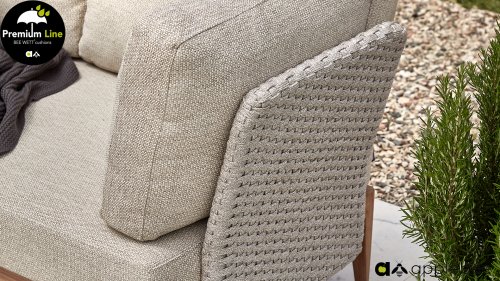 Ein naturbelassenes SVLK Teakholzgestell mit leicht konisch zulaufenden, abgerundeten Beinen verleiht dem Set eine raffinierte Basis. Lisa hat auch eine robuste Seite; Das straff geflochtene Sunproof Band verleiht der Lehne eine schöne Struktur. Zu jeder Tageszeit wirkt es anders, je nachdem, wie das Sonnenlicht das Geflecht beleuchtet. Weiche und bequeme Kissen, natürlich in Apple Bee's Bee Wett Qualität, runden das Bild ab. Hier können Sie stundenlang träumen!