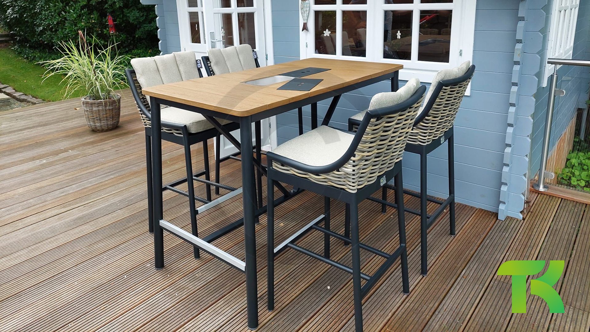 Der Milou-Bartisch wird mit einer Teakholzplatte geliefert, zusammen mit einem pulverbeschichteten Untergestell in Schwarz. Darüber hinaus enthält dieser Bartisch auch einen Weinkühler, um Ihre Getränke an