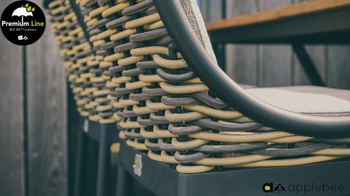 Apple Bee zeichnet sich durch die Verwendung des speziellen Biculair®-Geflechts aus, das ursprünglich für den professionellen Einsatz im Gastgewerbe entwickelt wurde. Dieses Biculair®-Geflecht ist eine naturgetreue und nachhaltige Alternative zu Rattan. Die äußerst strapazierfähige synthetische Rattanfaser (HDPE) ist absolut wetterfest, farbecht, recycelbar und somit eine umweltfreundliche Wahl. Aussehen und Funktionalität der Möbel bleiben von den europäischen Witterungsbedingungen unbeeinträchtigt, und die Farben behalten ihre natürliche Leuchtkraft. Die überlegene Qualität dieses Geflechts, bestätigt von der Niederländischen Organisation für Angewandte Naturwissenschaftliche Forschung (TNO), zeigt sich deutlich im Vergleich zu anderen vergleichbaren Materialien.