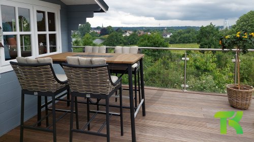 Gartenmöbel aus Teakholz bieten einen atemberaubenden Blick.Teakholz eignet sich besonders gut für den Einsatz im Außenbereich. Es ist resistent gegen Schädlinge und Pilze und widerstandsfähig gegen Sonne, Regen und Schnee. Mit der Zeit entwickelt das Teakholz eine silbergraue Patina. Gartenmöbel aus Teakholz bieten einen atemberaubenden Blick. Darüber hinaus ist es starkes Material und erfordert nur wenig Wartung. Wer die ursprüngliche Farbe des Teakholzes bevorzugt, kann durch regelmäßiges benutzen unser Pflegemittel ganz einfach das Vergrauen des Holzes verhindern.Darüber hinaus können Sie Teak mit grüner Seife reinigen. Durch Temperaturunterschiede und durch den Wechsel von Feuchtigkeit und Trockenheit können kleine Haarrisse entstehen. Es ist üblich, dass Man in dies Unvollkommenheiten findet, diese Unregelmäßigkeiten sind kennzeichnend für dieses Produkt. Diese Unregelmäßigkeiten können nie einen Anlass zu Reklamation, Garantie oder Claim formen. Es betrifft eine Unterschrift von Originalität! Wir gewähren Garantie auf alle Produktions- und Konstruktionsfehler. Die Wirkung von Teakholz ist nicht enthalten. Wenn Sie sich für Teakholz entscheiden, erwarten wir, dass Sie diese Eigenschaften zu schätzen wissen. Eventuell auftretende Haarrisse, Äste im Teakholz und raue Oberflächen im Laufe der Zeit fallen nicht unter unsere Garantie. Diese Eigenschaften verleihen dem Teakholz seinen eigenen Charakter und sind Teil der Optik. Seien Sie vorsichtig mit einem Blumentopf oder einer Vase auf Ihrem Gartentisch aus Teakholz, da dies zu hartnäckigen Kreisen oder Farbunterschieden führen kann.