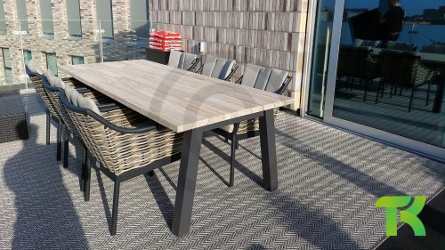 Gartenmöbel aus Teakholz bieten einen atemberaubenden Blick.Teakholz eignet sich besonders gut für den Einsatz im Außenbereich. Es ist resistent gegen Schädlinge und Pilze und widerstandsfähig gegen Sonne, Regen und Schnee. Mit der Zeit entwickelt das Teakholz eine silbergraue Patina. Gartenmöbel aus Teakholz bieten einen atemberaubenden Blick. Darüber hinaus ist es starkes Material und erfordert nur wenig Wartung. Wer die ursprüngliche Farbe des Teakholzes bevorzugt, kann durch regelmäßiges benutzen unser Pflegemittel ganz einfach das Vergrauen des Holzes verhindern.Darüber hinaus können Sie Teak mit grüner Seife reinigen. Durch Temperaturunterschiede und durch den Wechsel von Feuchtigkeit und Trockenheit können kleine Haarrisse entstehen. Es ist üblich, dass Man in dies Unvollkommenheiten findet, diese Unregelmäßigkeiten sind kennzeichnend für dieses Produkt. Diese Unregelmäßigkeiten können nie einen Anlass zu Reklamation, Garantie oder Claim formen. Es betrifft eine Unterschrift von Originalität!  Wir gewähren Garantie auf alle Produktions- und Konstruktionsfehler. Die Wirkung von Teakholz ist nicht enthalten. Wenn Sie sich für Teakholz entscheiden, erwarten wir, dass Sie diese Eigenschaften zu schätzen wissen. Eventuell auftretende Haarrisse, Äste im Teakholz und raue Oberflächen im Laufe der Zeit fallen nicht unter unsere Garantie. Diese Eigenschaften verleihen dem Teakholz seinen eigenen Charakter und sind Teil der Optik. Seien Sie vorsichtig mit einem Blumentopf oder einer Vase auf Ihrem Gartentisch aus Teakholz, da dies zu hartnäckigen Kreisen oder Farbunterschieden führen kann.