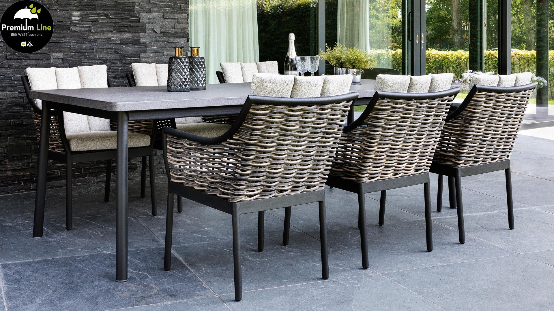 Das Apple Bee Milou Dining-Set in Black besticht durch seine natürliche Optik und die gewohnte, robuste Biculair®-Qualität für den Außenbereich, die Sie von Apple Bee kennen. Das Rattan-Geflecht wird von einem schwarz pulverbeschichteten Rahmen mit geschwungenen Linien eingefasst, der dem Milou Garten-Set seinen eleganten, modernen Look verleiht. Die Premium-Kissen sind mit der Bee Wett®-Technologie ausgestattet, die ein schnelles Trocknen nach einem starken Regenschauer gewährleistet. So können Sie die Kissen einfach draußen lassen. Die Drainage an der Unterseite der Kissen sorgt dafür, dass Wasser problemlos ablaufen kann.