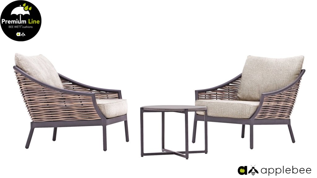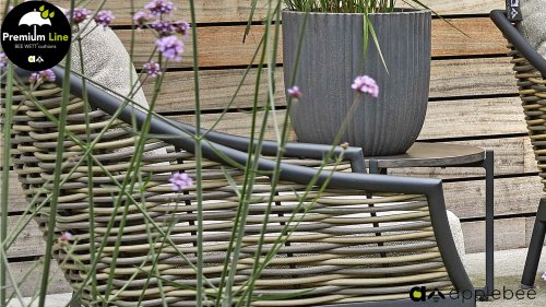 Apple Bee zeichnet sich durch die Verwendung des speziellen Biculair®-Geflechts aus, das ursprünglich für den professionellen Einsatz im Gastgewerbe entwickelt wurde. Dieses Biculair®-Geflecht ist eine naturgetreue und nachhaltige Alternative zu Rattan. Die äußerst strapazierfähige synthetische Rattanfaser (HDPE) ist absolut wetterfest, farbecht, recycelbar und somit eine umweltfreundliche Wahl. Aussehen und Funktionalität der Möbel bleiben von den europäischen Witterungsbedingungen unbeeinträchtigt, und die Farben behalten ihre natürliche Leuchtkraft. Die überlegene Qualität dieses Geflechts, bestätigt von der Niederländischen Organisation für Angewandte Naturwissenschaftliche Forschung (TNO), zeigt sich deutlich im Vergleich zu anderen vergleichbaren Materialien.