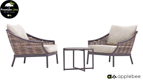 Die Apple Bee Milou Lounge Black besticht durch ihre elegante Flechtoptik und verleiht Ihrer Lounge-Garnitur eine natürliche Note! Sie bietet großzügigen Sitzkomfort und dicke Kissen mit Apple Bees bewährter Bee Wett®-Technologie. Das Gestell besteht aus pulverbeschichtetem Aluminium in Austernfarbe, kombiniert mit robustem Biculair-Flechtgeflecht. Dieses Flechtgeflecht wird von einem ebenfalls pulverbeschichteten Rahmen in Black mit geschwungenen Linien eingefasst, was der Milou ihren schicken, modernen Look verleiht.