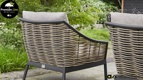 Apple Bee zeichnet sich durch die Verwendung des speziellen Biculair®-Geflechts aus, das ursprünglich für den professionellen Einsatz im Gastgewerbe entwickelt wurde. Dieses Biculair®-Geflecht ist eine naturgetreue und nachhaltige Alternative zu Rattan. Die äußerst strapazierfähige synthetische Rattanfaser (HDPE) ist absolut wetterfest, farbecht, recycelbar und somit eine umweltfreundliche Wahl. Aussehen und Funktionalität der Möbel bleiben von den europäischen Witterungsbedingungen unbeeinträchtigt, und die Farben behalten ihre natürliche Leuchtkraft. Die überlegene Qualität dieses Geflechts, bestätigt von der Niederländischen Organisation für Angewandte Naturwissenschaftliche Forschung (TNO), zeigt sich deutlich im Vergleich zu anderen vergleichbaren Materialien.