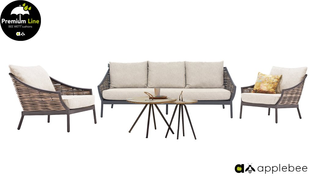 Die Apple Bee Milou Lounge Black besticht durch ihre elegante Flechtoptik und verleiht Ihrer Lounge-Garnitur eine natürliche Note! Sie bietet großzügigen Sitzkomfort und dicke Kissen mit Apple Bees bewährter Bee Wett®-Technologie. Das Gestell besteht aus pulverbeschichtetem Aluminium in Austernfarbe, kombiniert mit robustem Biculair-Flechtgeflecht. Dieses Flechtgeflecht wird von einem ebenfalls pulverbeschichteten Rahmen in Black mit geschwungenen Linien eingefasst, was der Milou ihren schicken, modernen Look verleiht.