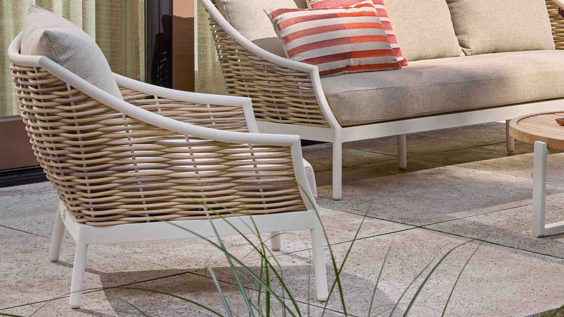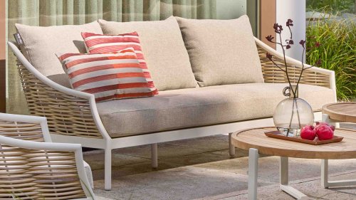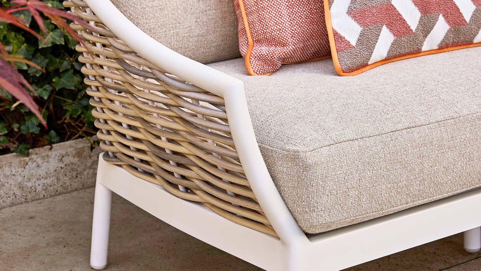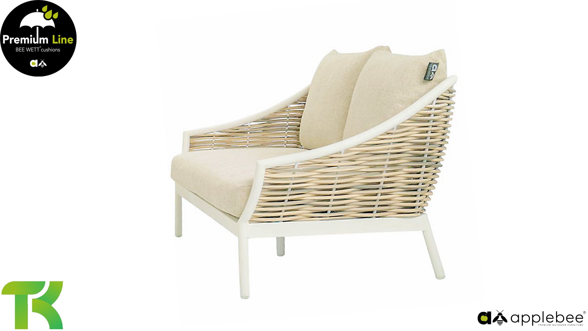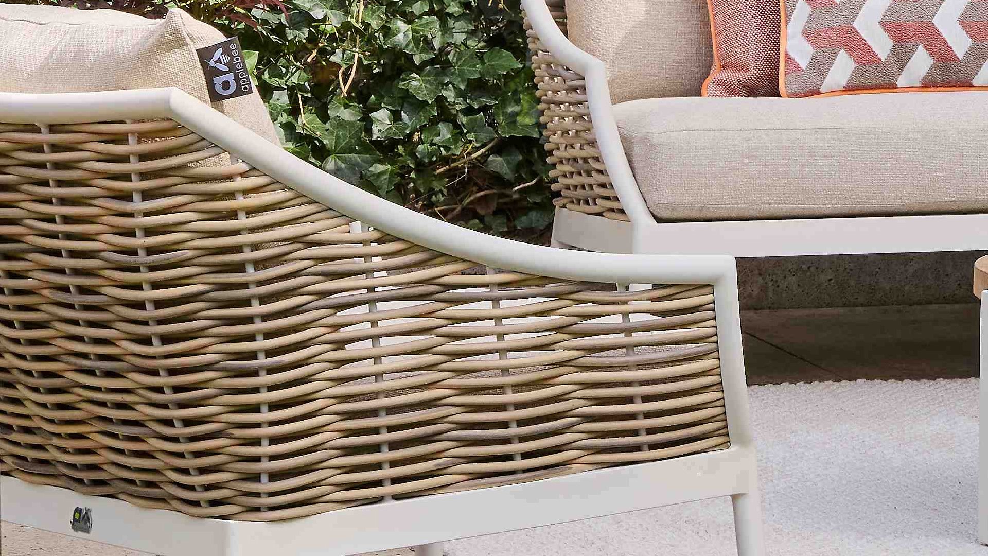Die Apple Bee Milou Lounge Oyster besticht durch ihre elegante Flechtoptik und verleiht Ihrer Lounge-Garnitur eine natürliche Note! Sie bietet großzügigen Sitzkomfort und dicke Kissen mit Apple Bees bewährter Bee Wett®-Technologie. Das Gestell besteht aus pulverbeschichtetem Aluminium in Austernfarbe, kombiniert mit robustem Biculair-Flechtgeflecht. Dieses Flechtgeflecht wird von einem ebenfalls pulverbeschichteten Rahmen in Austernfarbe mit geschwungenen Linien eingefasst, was der Milou ihren schicken, modernen Look verleiht.