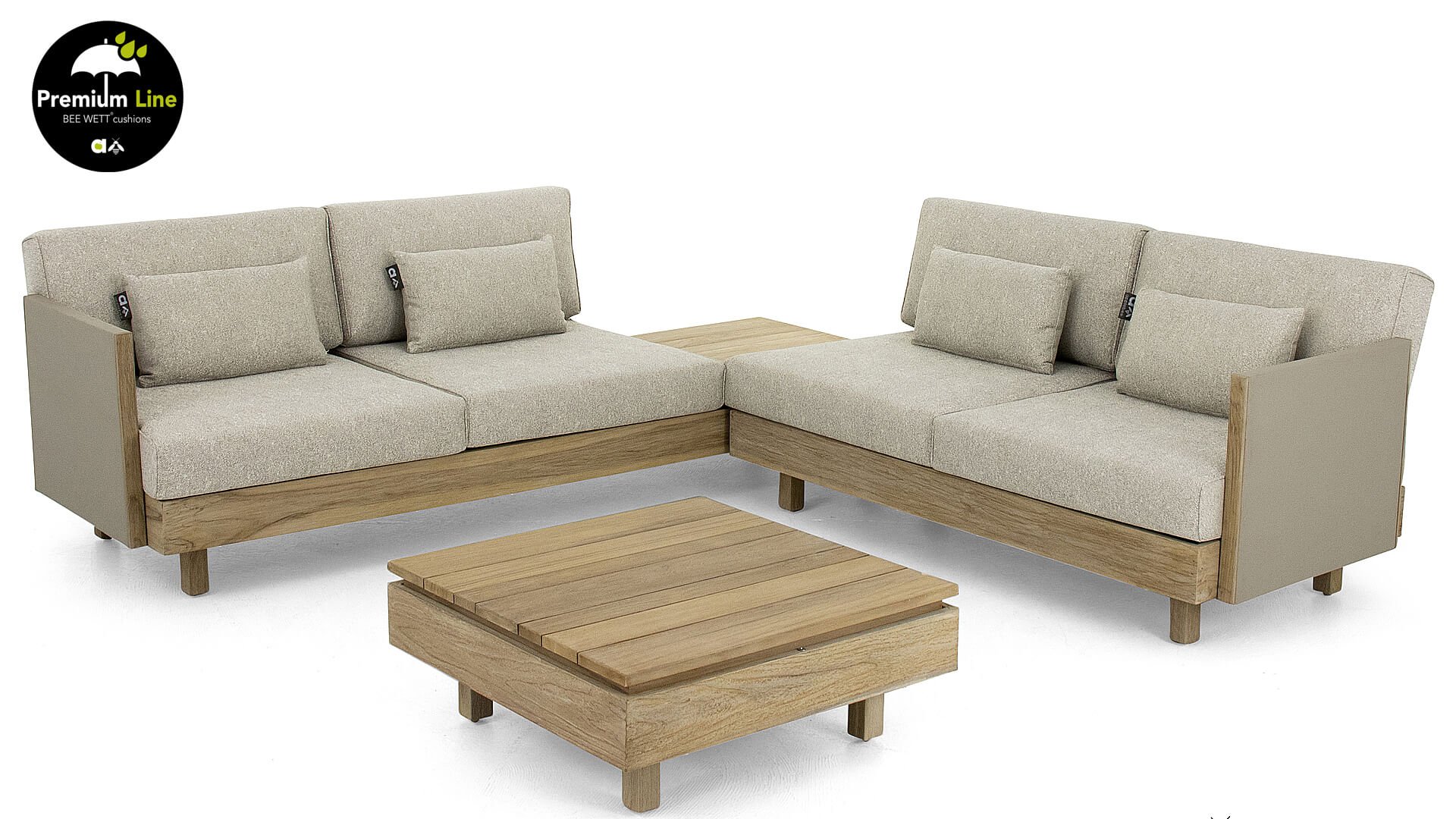 Das Applebee Lounge-Set Module X besteht aus extrem starkem Teakholz, das mit einem sogenannten neuen Coastal Finish versehen ist, das Ihren Möbeln ein frisches Aussehen verleiht. Die Sitz- und Rückenkissen in dieser Reihe ist mit der BEE WETT®-Technologie, die perfekte Ableitung von Feuchtigkeit gewährleistet.