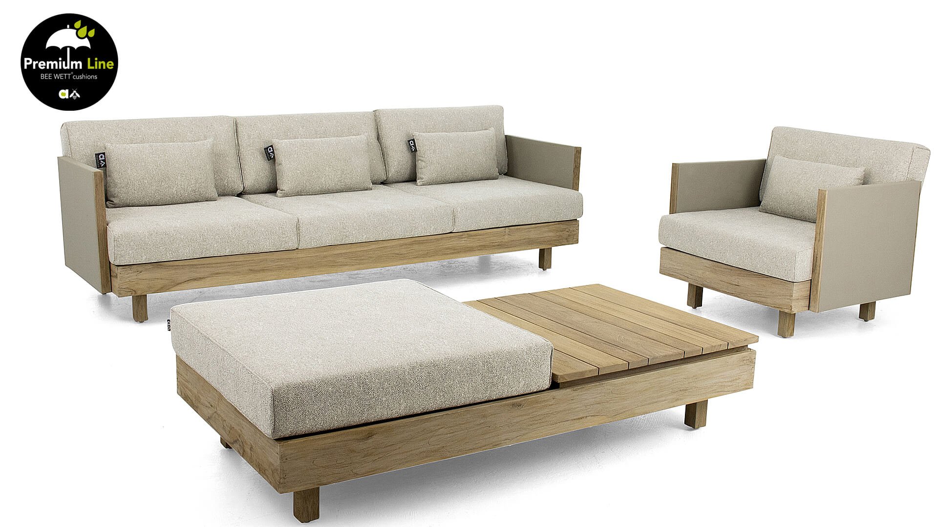 Das Applebee Lounge-Set Module X besteht aus extrem starkem Teakholz, das mit einem sogenannten neuen Coastal Finish versehen ist, das Ihren Möbeln ein frisches Aussehen verleiht. Die Sitz- und Rückenkissen in dieser Reihe ist mit der BEE WETT®-Technologie, die perfekte Ableitung von Feuchtigkeit gewährleistet.