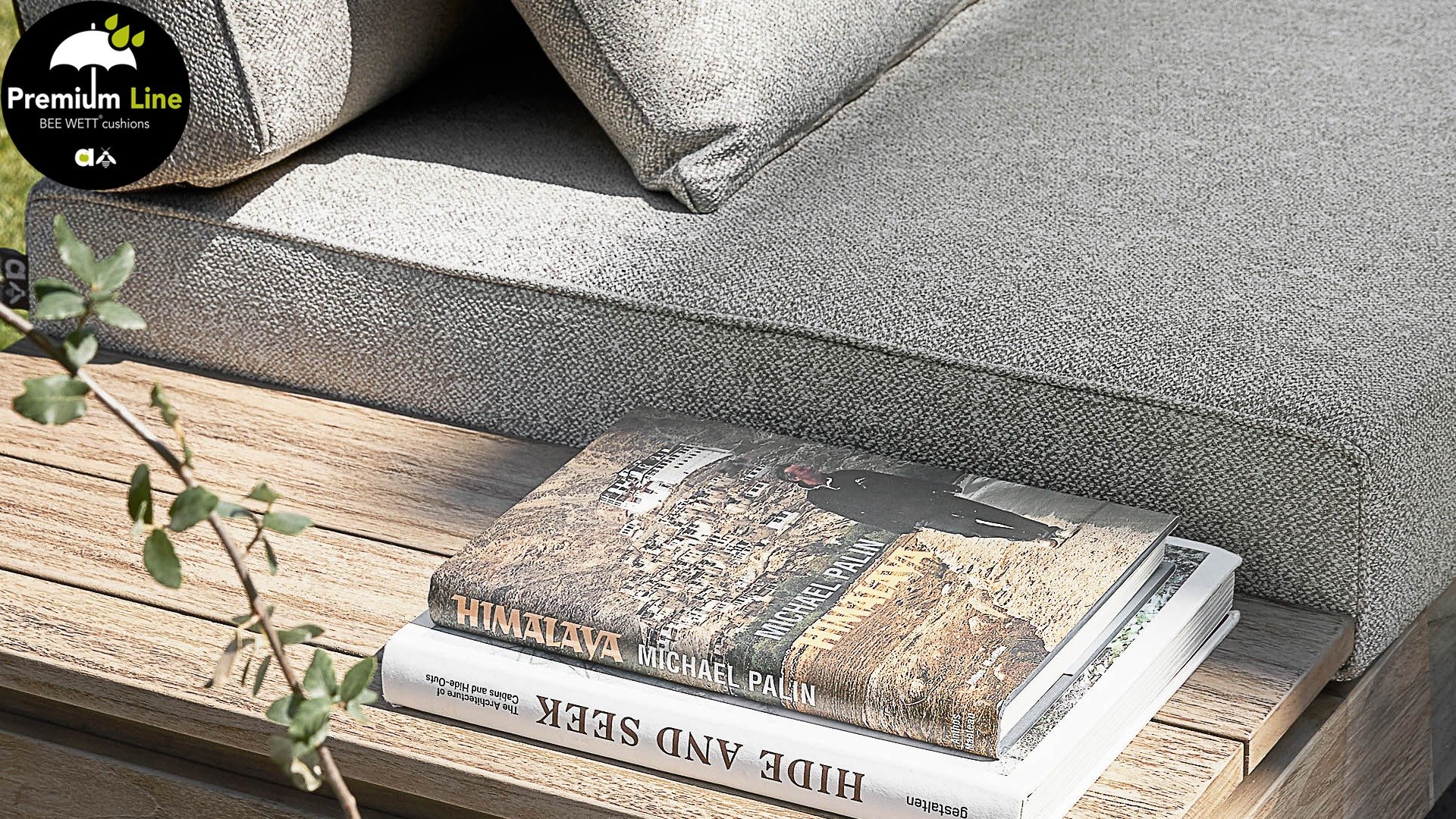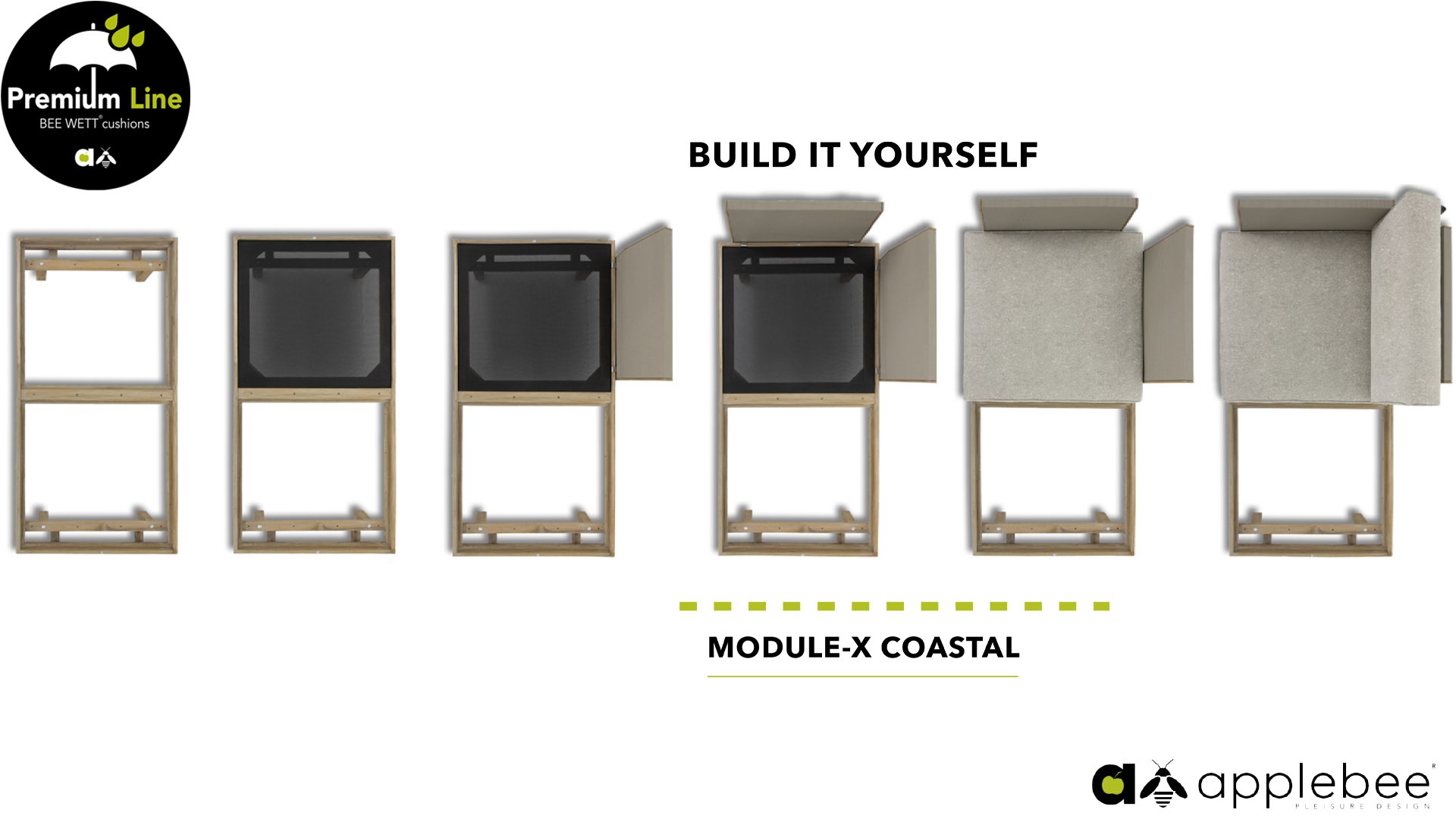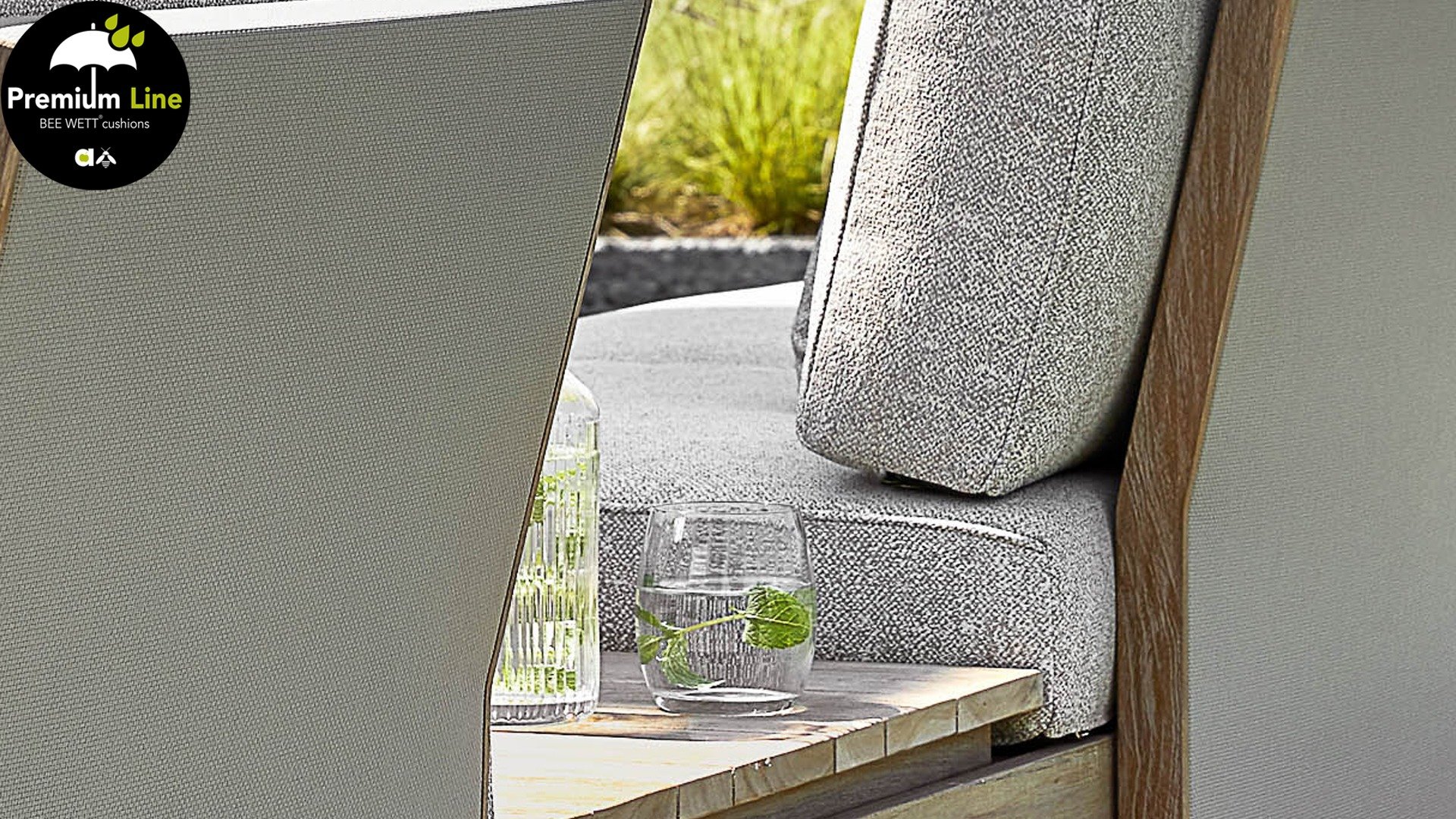Das Applebee Lounge-Set Module X besteht aus extrem starkem Teakholz, das mit einem sogenannten neuen Coastal Finish versehen ist, das Ihren Möbeln ein frisches Aussehen verleiht. Die Sitz- und Rückenkissen in dieser Reihe ist mit der BEE WETT®-Technologie, die perfekte Ableitung von Feuchtigkeit gewährleistet.
