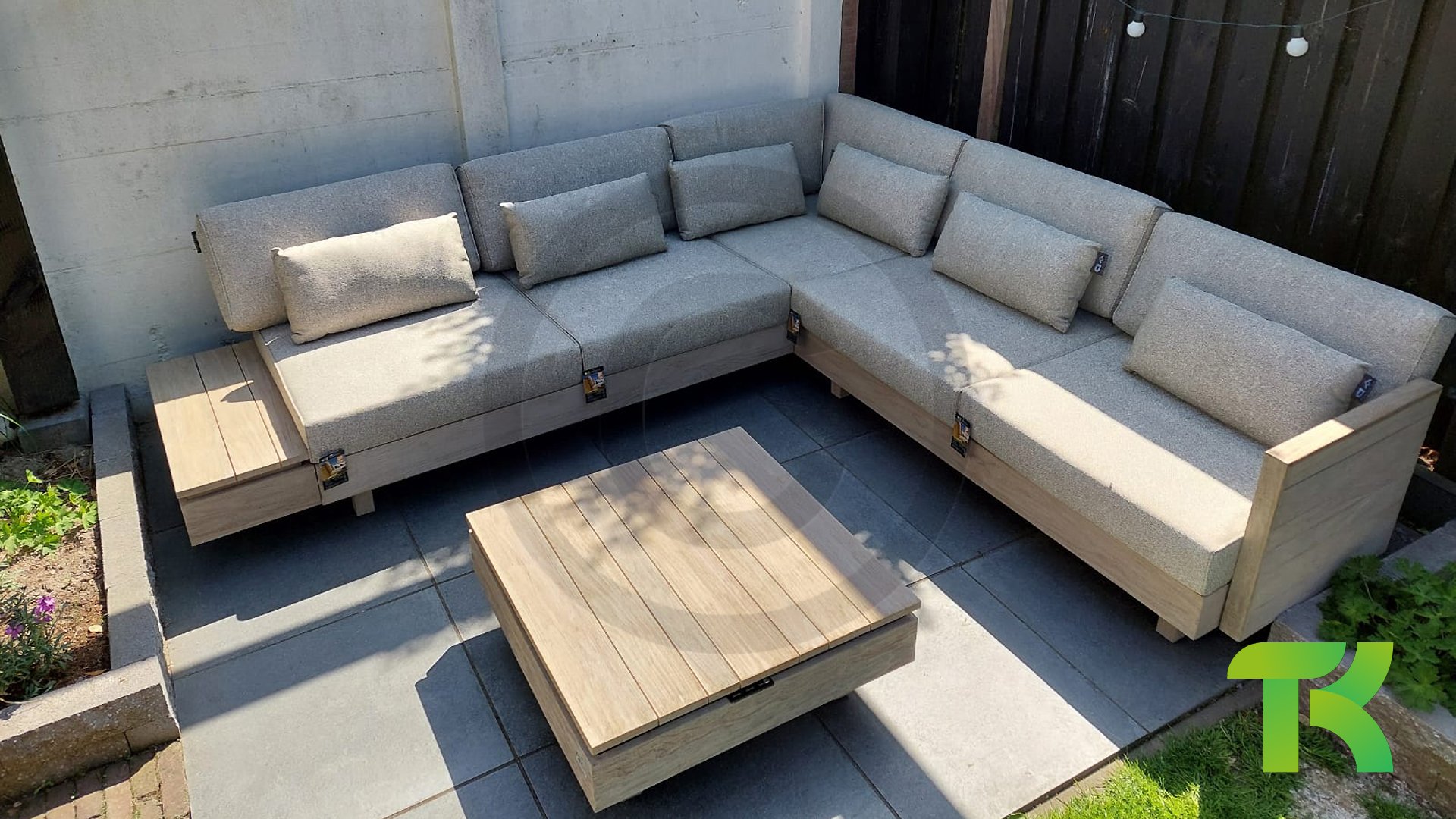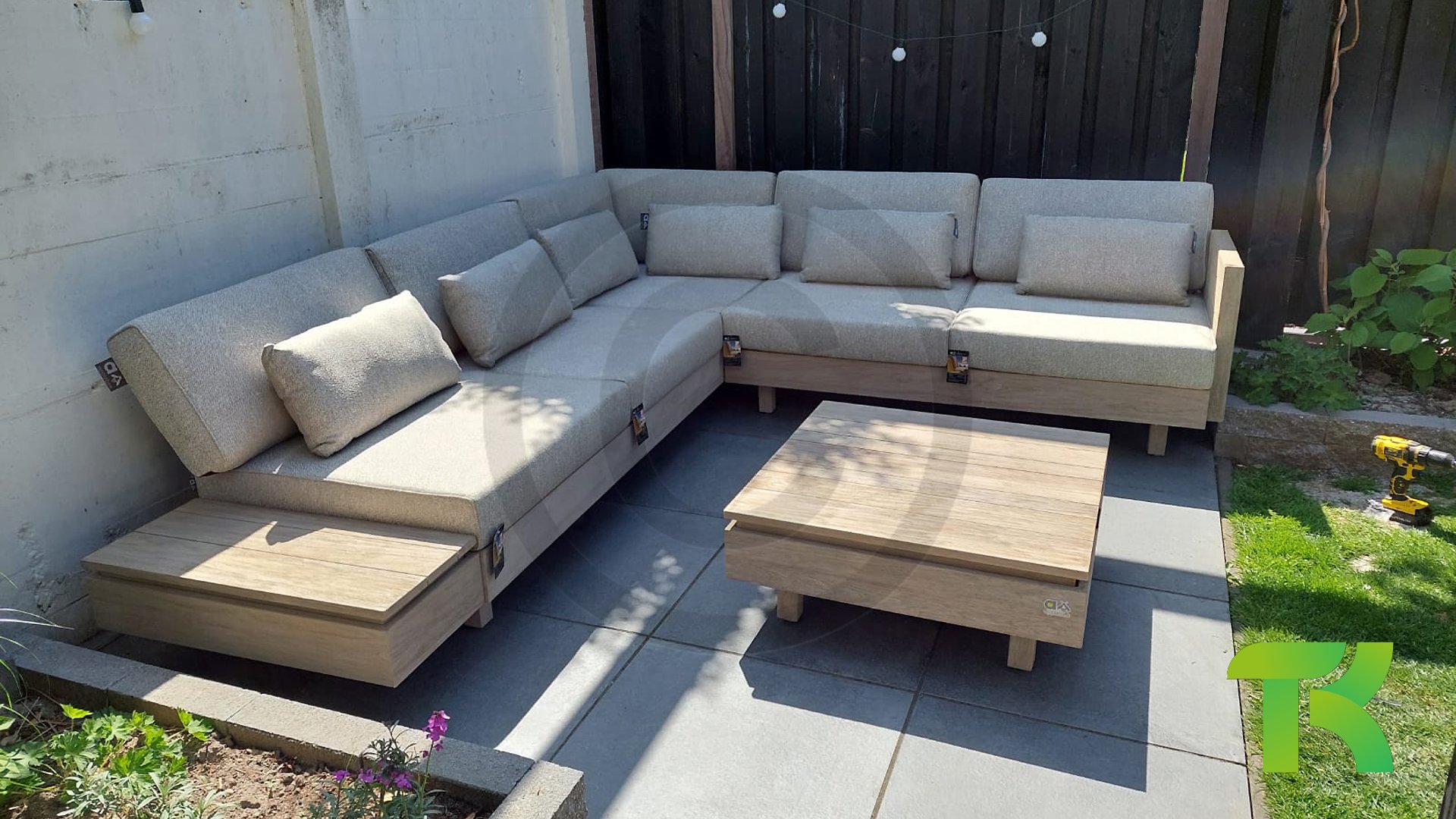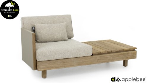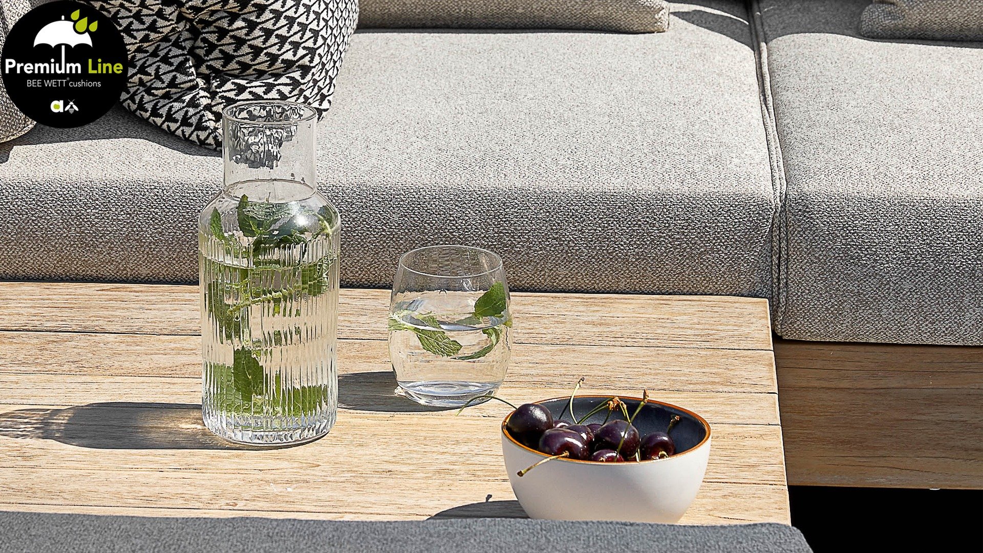 Das Applebee Lounge-Set Module X besteht aus extrem starkem Teakholz, das mit einem sogenannten neuen Coastal Finish versehen ist, das Ihren Möbeln ein frisches Aussehen verleiht. Die Sitz- und Rückenkissen in dieser Reihe ist mit der BEE WETT®-Technologie, die perfekte Ableitung von Feuchtigkeit gewährleistet.