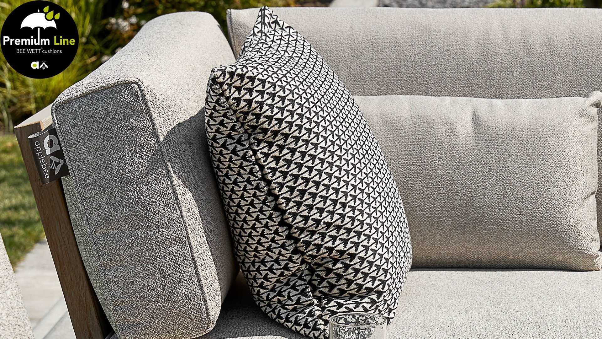 AppleBee BEE WETT sind spezielle wetterfeste Kissen die natürlich draussen liegen bleiben können. Die abnehmbaren Hüllen werden aus den bestenmöglichen Stoffen hergestellt und sind alle waschbar auf 30°. Der Stoff ist zusätzlich wasserabstoßend und garantiert UV-beständig. Eine offenes Gewebe an der Unterseite der Kissen sorgt für eine perfekte Drainage. Der Vorteil, dass die BEE WETT Kissen und Polster unglaublich viel schneller trocknen als vergleichbare andere Kissen. Das Stoff hat eine gute Beständigkeit gegen Verfaulen und Stockflecken und darüber hinaus UV-beständig, weich, komfortabel und feuchtigkeitsabstoßend ist. Die Polster sind ausziehbar und waschbar.
