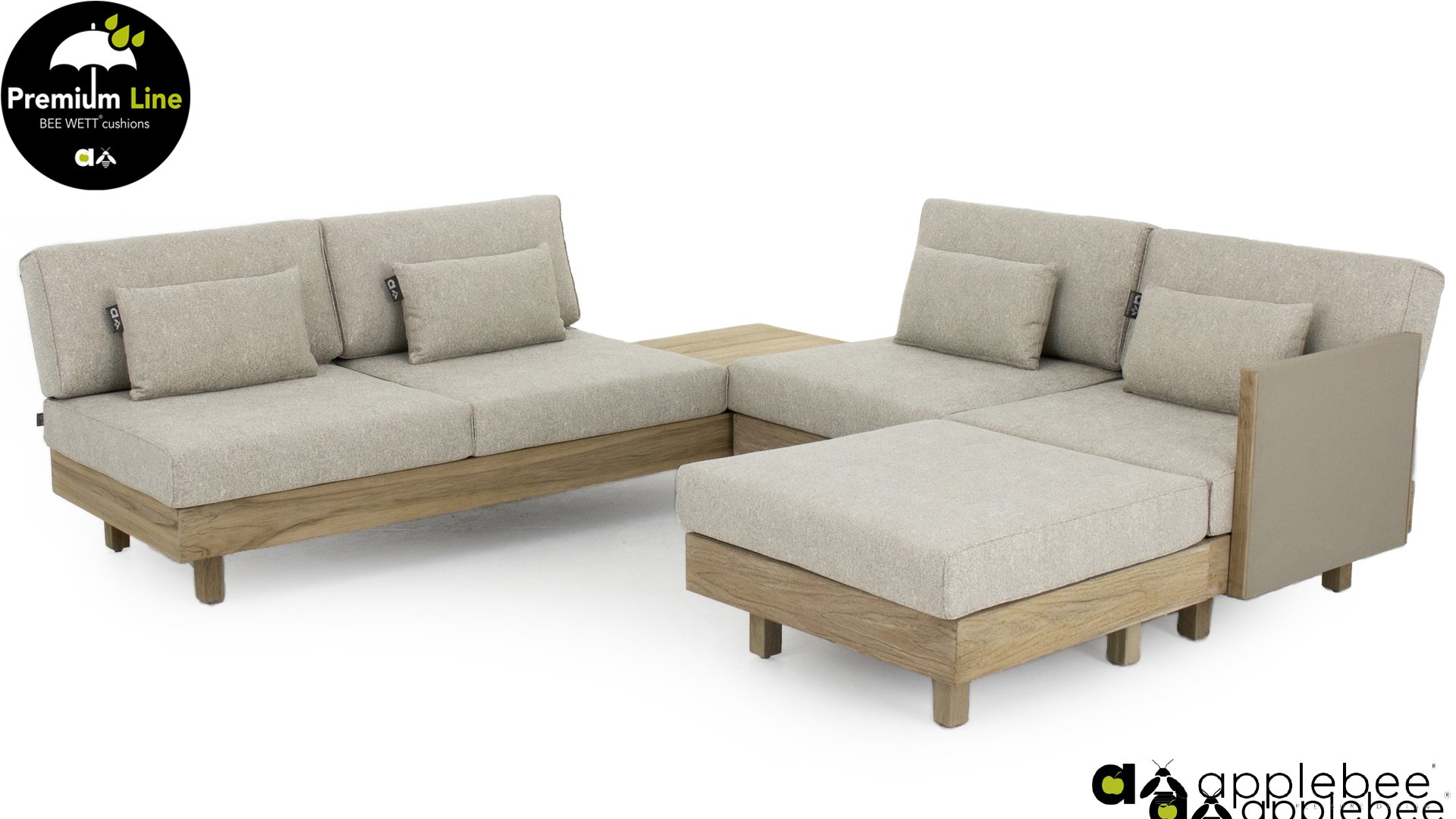 Das Applebee Lounge-Set Module X besteht aus extrem starkem Teakholz, das mit einem sogenannten neuen Coastal Finish versehen ist, das Ihren Möbeln ein frisches Aussehen verleiht. Die Sitz- und Rückenkissen in dieser Reihe ist mit der BEE WETT®-Technologie, die perfekte Ableitung von Feuchtigkeit gewährleistet.