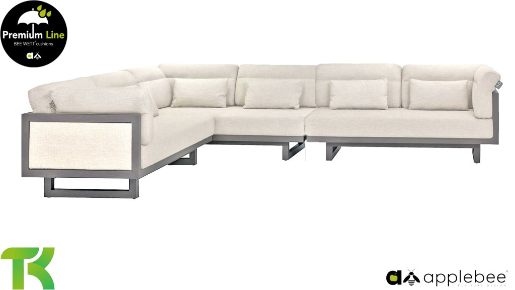 Apple Bee Santorini Lounge: Wenn Sie ein straffes und kubistisches Lounge-Set mögen, aber nicht auf Eigenwilligkeit verzichten möchten... hier ist Santorini! Ein straffes, Aluminium-Vierkantrohrgestell, pulverbeschichtet in warmem Taupe. Dieses Set ist in zwei Ausführungen erhältlich. Der Unterschied liegt in den Paneelen in den Armlehnen und der Rückenlehne, die durch den Rahmen wie ein Gemälde umrahmt wirken. In der ersten Ausführung ist das Paneel mit wunderschön meliertem Seil umwickelt. Dadurch behält das Set Leichtigkeit mit einem zeitgemäßen Look. Die andere Ausführung hat gepolsterte Paneelen im selben Stoff wie die Kissen. Dadurch erhält das Set sofort mehr Klasse und Luxus.