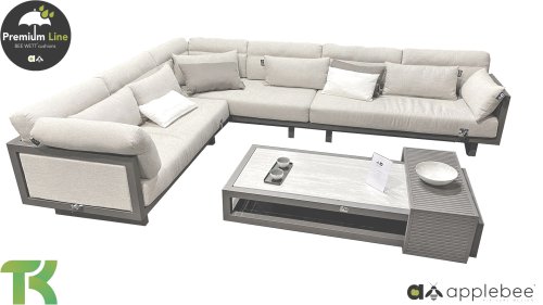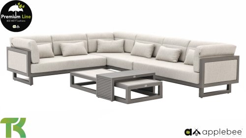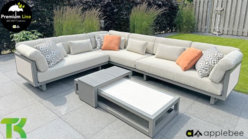 Apple Bee Santorini Lounge: Wenn Sie ein straffes und kubistisches Lounge-Set mögen, aber nicht auf Eigenwilligkeit verzichten möchten... hier ist Santorini! Ein straffes, Aluminium-Vierkantrohrgestell, pulverbeschichtet in warmem Taupe. Dieses Set ist in zwei Ausführungen erhältlich. Der Unterschied liegt in den Paneelen in den Armlehnen und der Rückenlehne, die durch den Rahmen wie ein Gemälde umrahmt wirken. In der ersten Ausführung ist das Paneel mit wunderschön meliertem Seil umwickelt. Dadurch behält das Set Leichtigkeit mit einem zeitgemäßen Look. Die andere Ausführung hat gepolsterte Paneelen im selben Stoff wie die Kissen. Dadurch erhält das Set sofort mehr Klasse und Luxus.