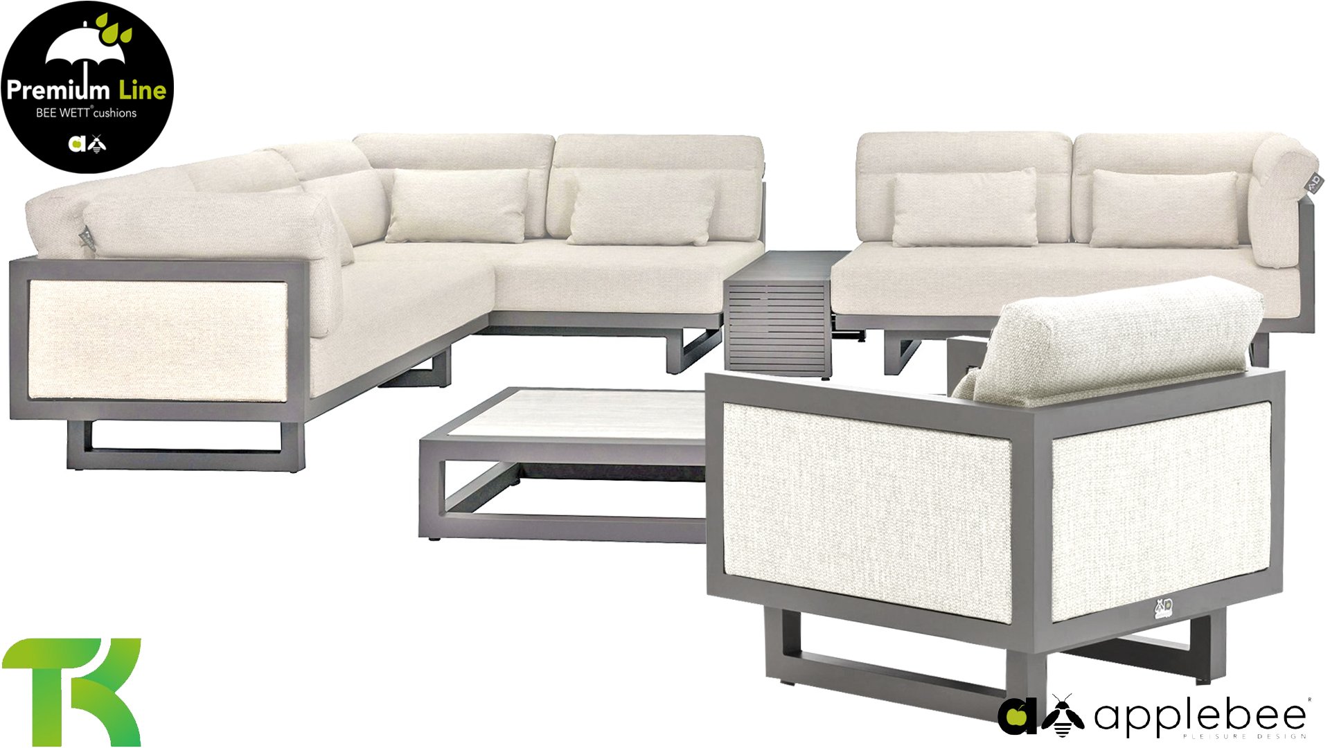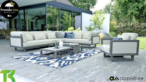 Apple Bee Santorini Lounge: Wenn Sie ein straffes und kubistisches Lounge-Set mögen, aber nicht auf Eigenwilligkeit verzichten möchten... hier ist Santorini! Ein straffes, Aluminium-Vierkantrohrgestell, pulverbeschichtet in warmem Taupe. Dieses Set ist in zwei Ausführungen erhältlich. Der Unterschied liegt in den Paneelen in den Armlehnen und der Rückenlehne, die durch den Rahmen wie ein Gemälde umrahmt wirken. In der ersten Ausführung ist das Paneel mit wunderschön meliertem Seil umwickelt. Dadurch behält das Set Leichtigkeit mit einem zeitgemäßen Look. Die andere Ausführung hat gepolsterte Paneelen im selben Stoff wie die Kissen. Dadurch erhält das Set sofort mehr Klasse und Luxus.