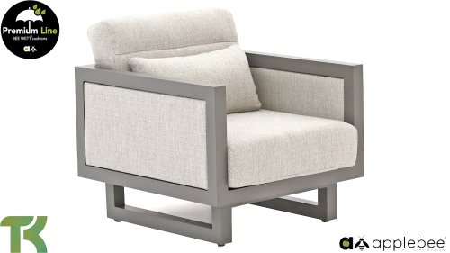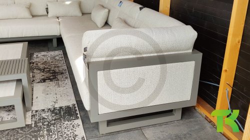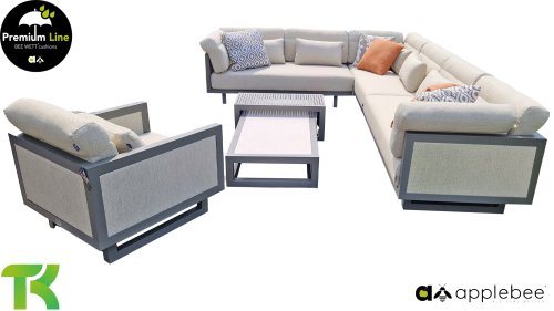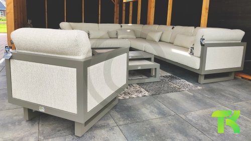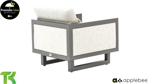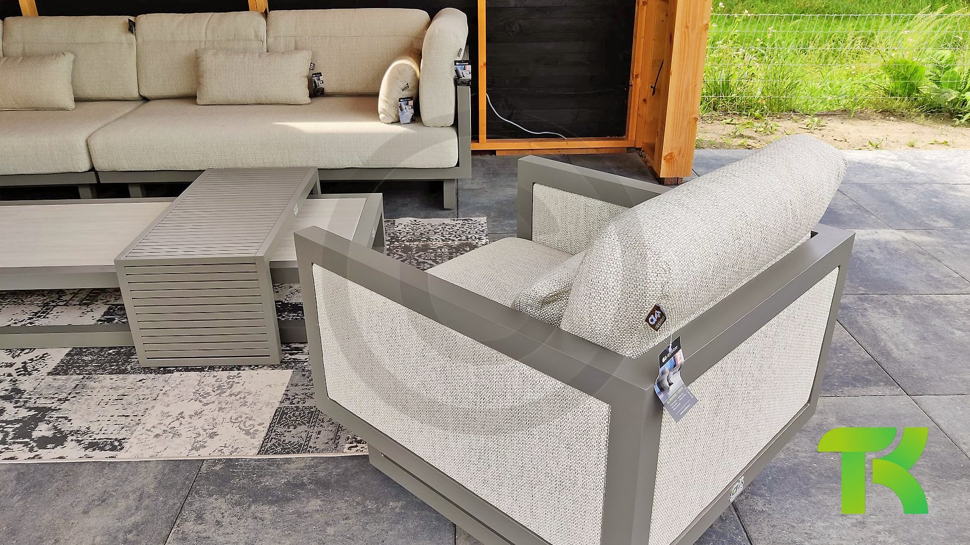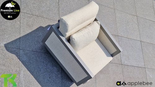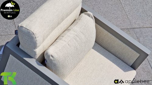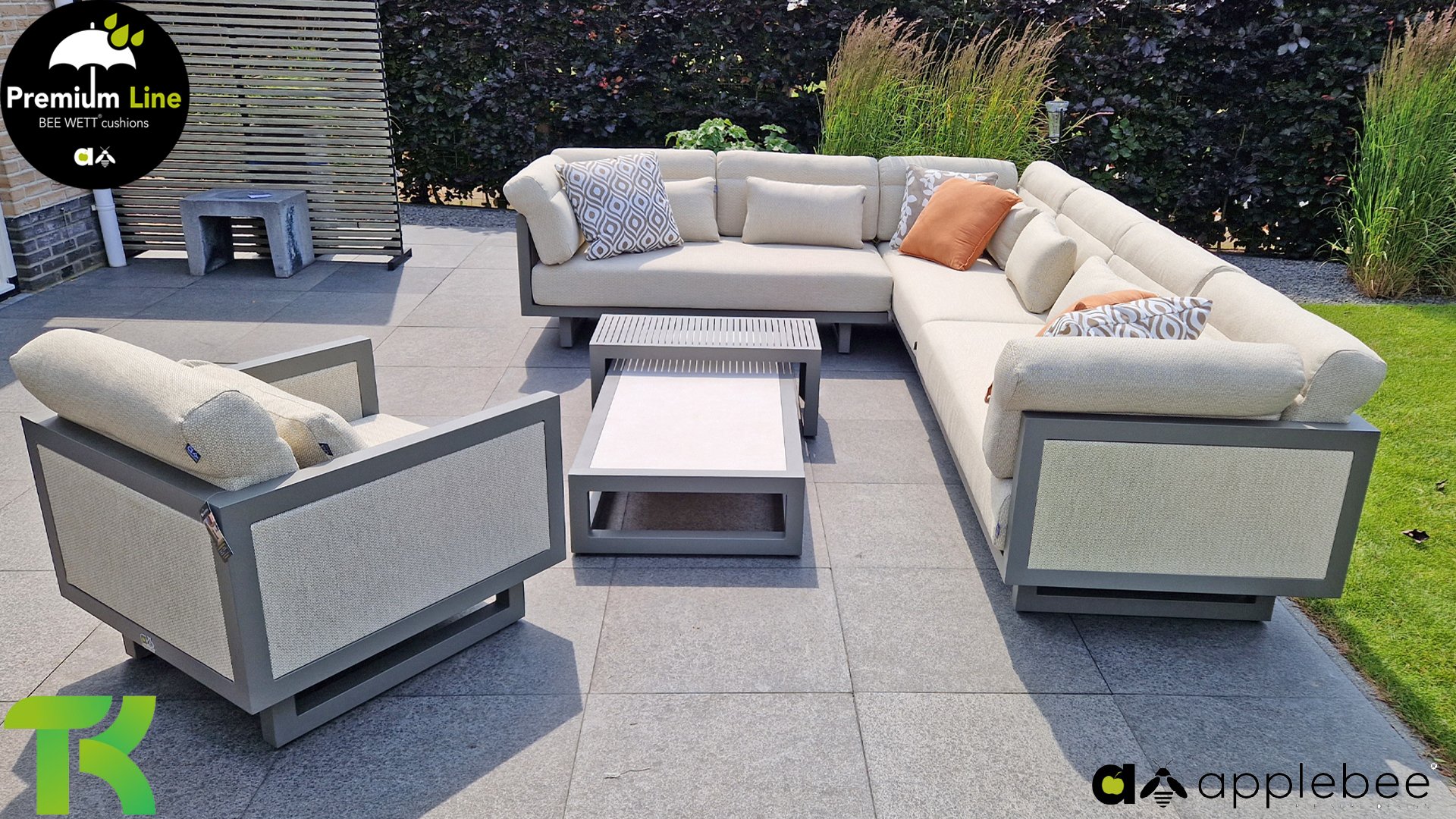 Apple Bee Santorini Lounge: Wenn Sie ein straffes und kubistisches Lounge-Set mögen, aber nicht auf Eigenwilligkeit verzichten möchten... hier ist Santorini! Ein straffes, Aluminium-Vierkantrohrgestell, pulverbeschichtet in warmem Taupe. Dieses Set ist in zwei Ausführungen erhältlich. Der Unterschied liegt in den Paneelen in den Armlehnen und der Rückenlehne, die durch den Rahmen wie ein Gemälde umrahmt wirken. In der ersten Ausführung ist das Paneel mit wunderschön meliertem Seil umwickelt. Dadurch behält das Set Leichtigkeit mit einem zeitgemäßen Look. Die andere Ausführung hat gepolsterte Paneelen im selben Stoff wie die Kissen. Dadurch erhält das Set sofort mehr Klasse und Luxus.