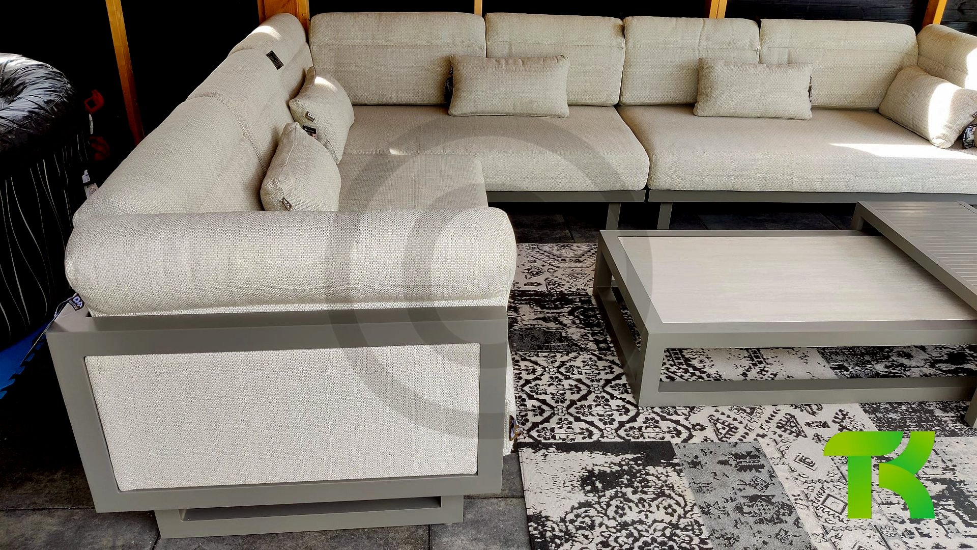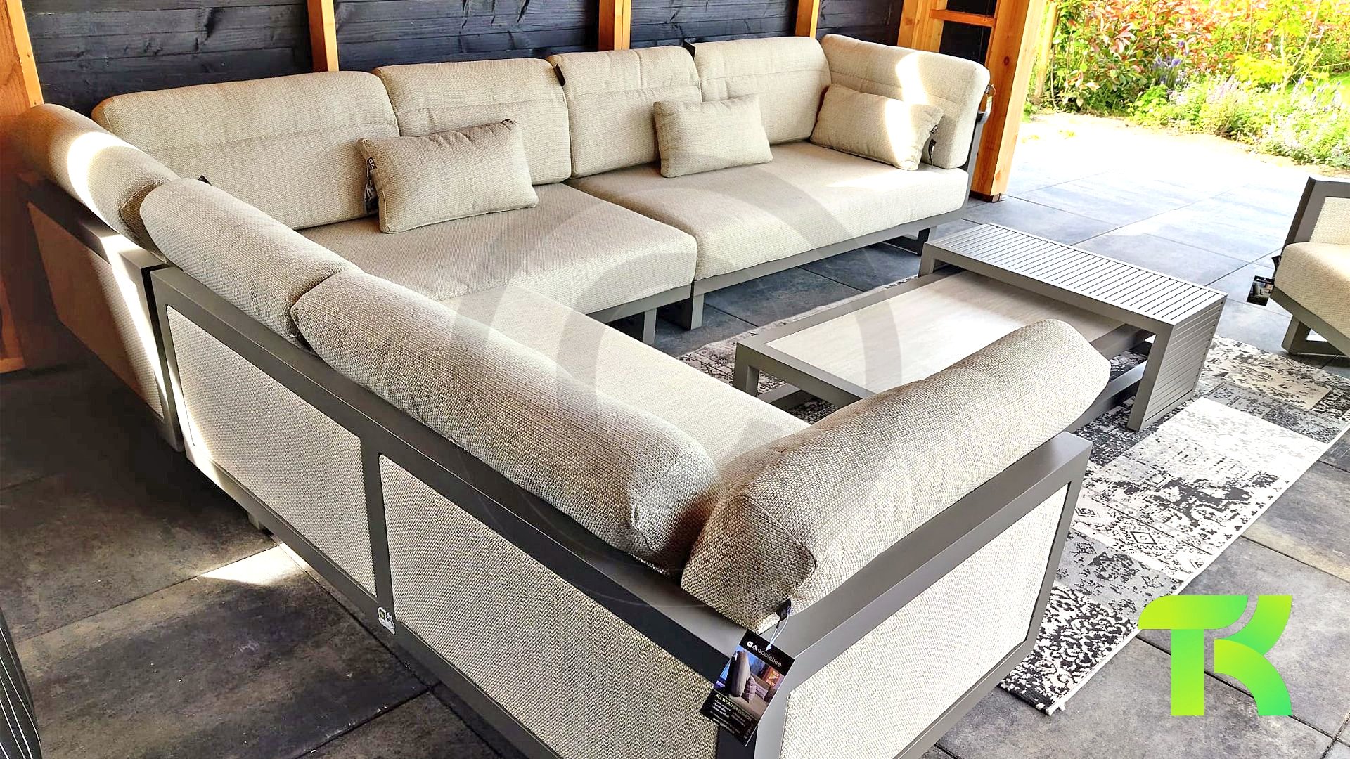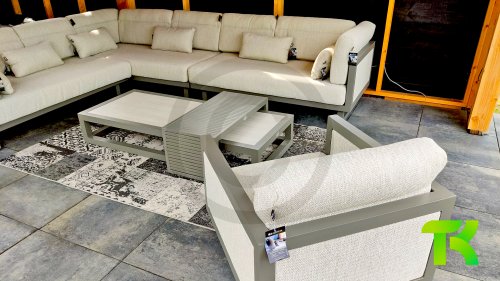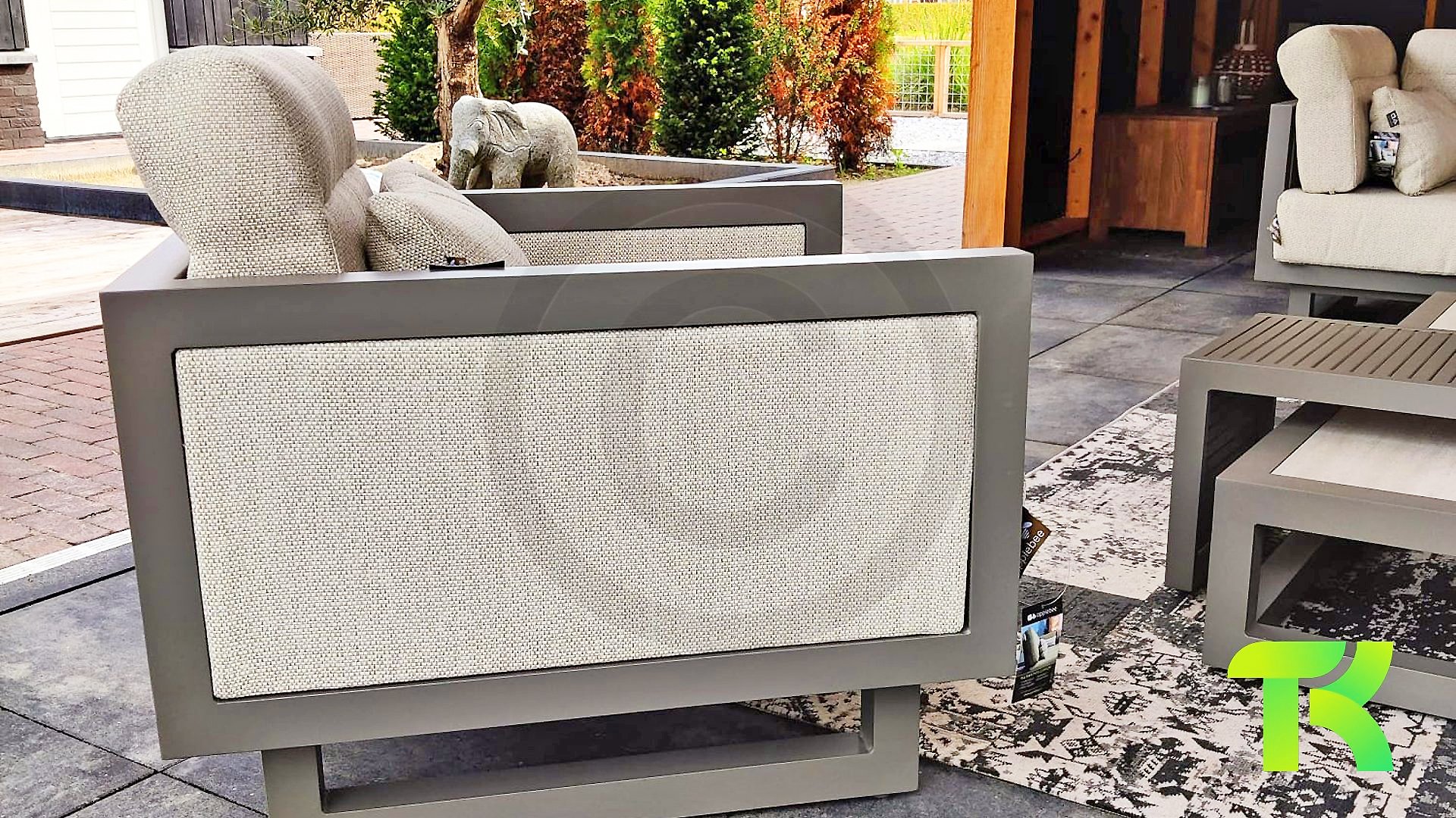 Apple Bee Santorini Lounge: Wenn Sie ein straffes und kubistisches Lounge-Set mögen, aber nicht auf Eigenwilligkeit verzichten möchten... hier ist Santorini! Ein straffes, Aluminium-Vierkantrohrgestell, pulverbeschichtet in warmem Taupe. Dieses Set ist in zwei Ausführungen erhältlich. Der Unterschied liegt in den Paneelen in den Armlehnen und der Rückenlehne, die durch den Rahmen wie ein Gemälde umrahmt wirken. In der ersten Ausführung ist das Paneel mit wunderschön meliertem Seil umwickelt. Dadurch behält das Set Leichtigkeit mit einem zeitgemäßen Look. Die andere Ausführung hat gepolsterte Paneelen im selben Stoff wie die Kissen. Dadurch erhält das Set sofort mehr Klasse und Luxus.