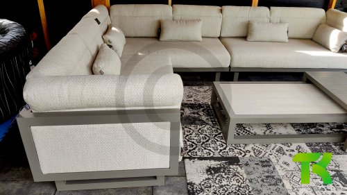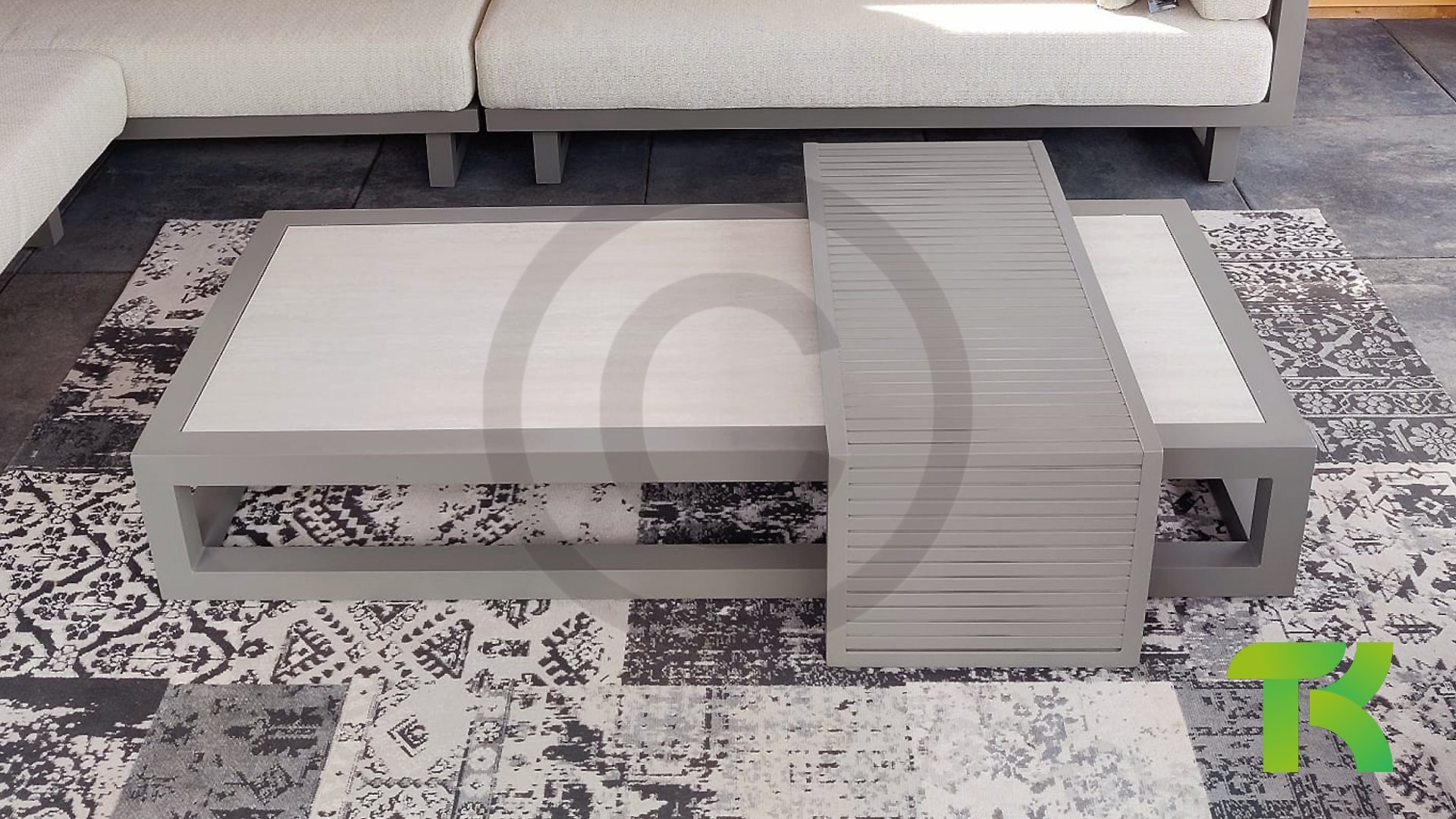 Die Apple Bee Santorini Kaffeetisch-Gruppe, dessen Basis aus Aluminium in der Farbe Quarz besteht. Die Platte des 155 cm langen Tisches ist aus Keramik in der Farbe Travetino. Eine elegante Kombination, besonders mit dem AppleBee Santorini Lounge!