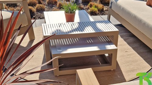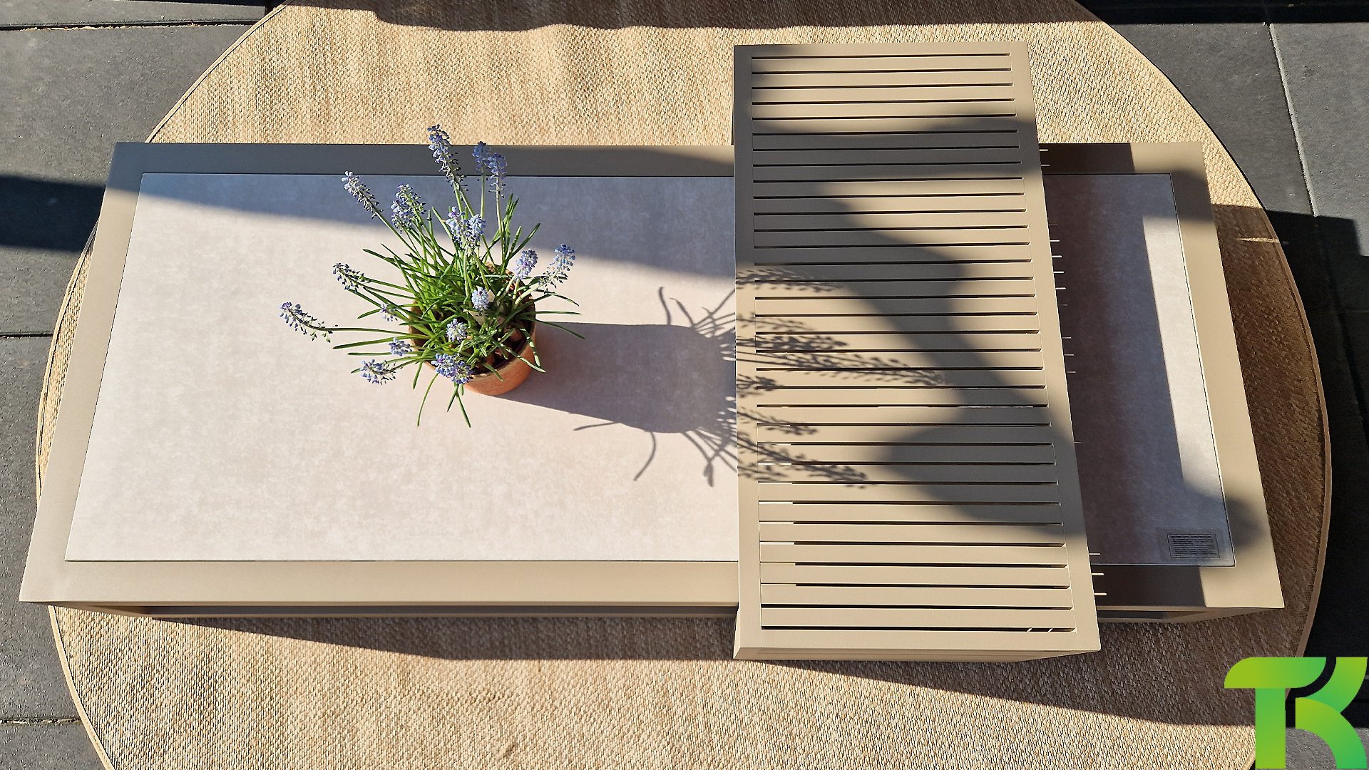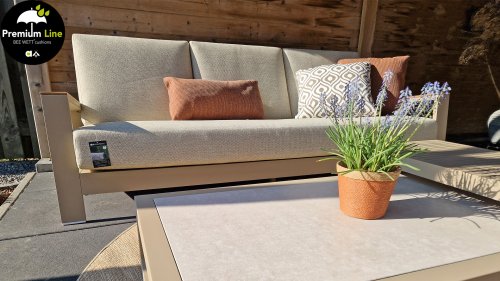 Der AppleBee Santorini Couchtisch 155cm, dessen Gestell aus Aluminium in der Farbe Quarz ist. Die Platte besteht aus Keramik in der Farbe Travetino. Ein eleganter Tisch, der gut zu dem AppleBee Santorini Loungeset oder dem AppleBee Santorini Loungeset Rope passt!