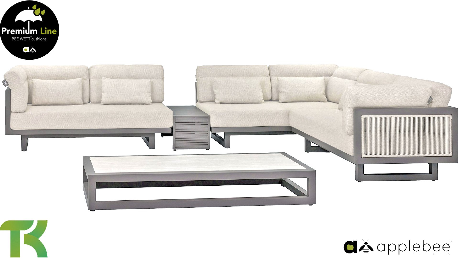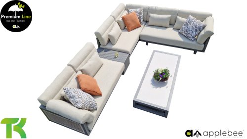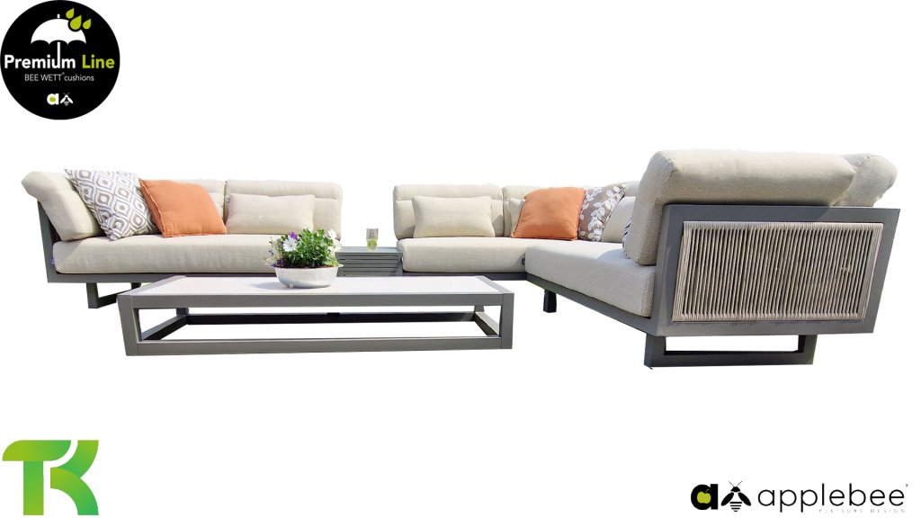 Apple Bee Santorini Lounge Rope: Wenn Sie eine elegante, kubistische Lounge-Garnitur lieben, aber dennoch Wert auf Individualität legen, dann ist die Santorini genau das Richtige für Sie! Ein schlankes, quadratisches Aluminiumrohrgestell, pulverbeschichtet in warmem Taupe. Diese Garnitur ist in zwei Ausführungen erhältlich. Der Unterschied liegt in den Paneelen an Armlehnen und Rückenlehne, die wie ein Gemälde vom Gestell eingerahmt werden. Bei der ersten Ausführung sind die Paneele mit einem wunderschönen, melierten Seil umwickelt. Dies verleiht der Garnitur eine luftige und zugleich moderne Optik. Die zweite Ausführung besticht durch gepolsterte Paneele im gleichen Stoff wie die Kissen und verleiht ihr so einen Hauch von Klasse und Luxus.