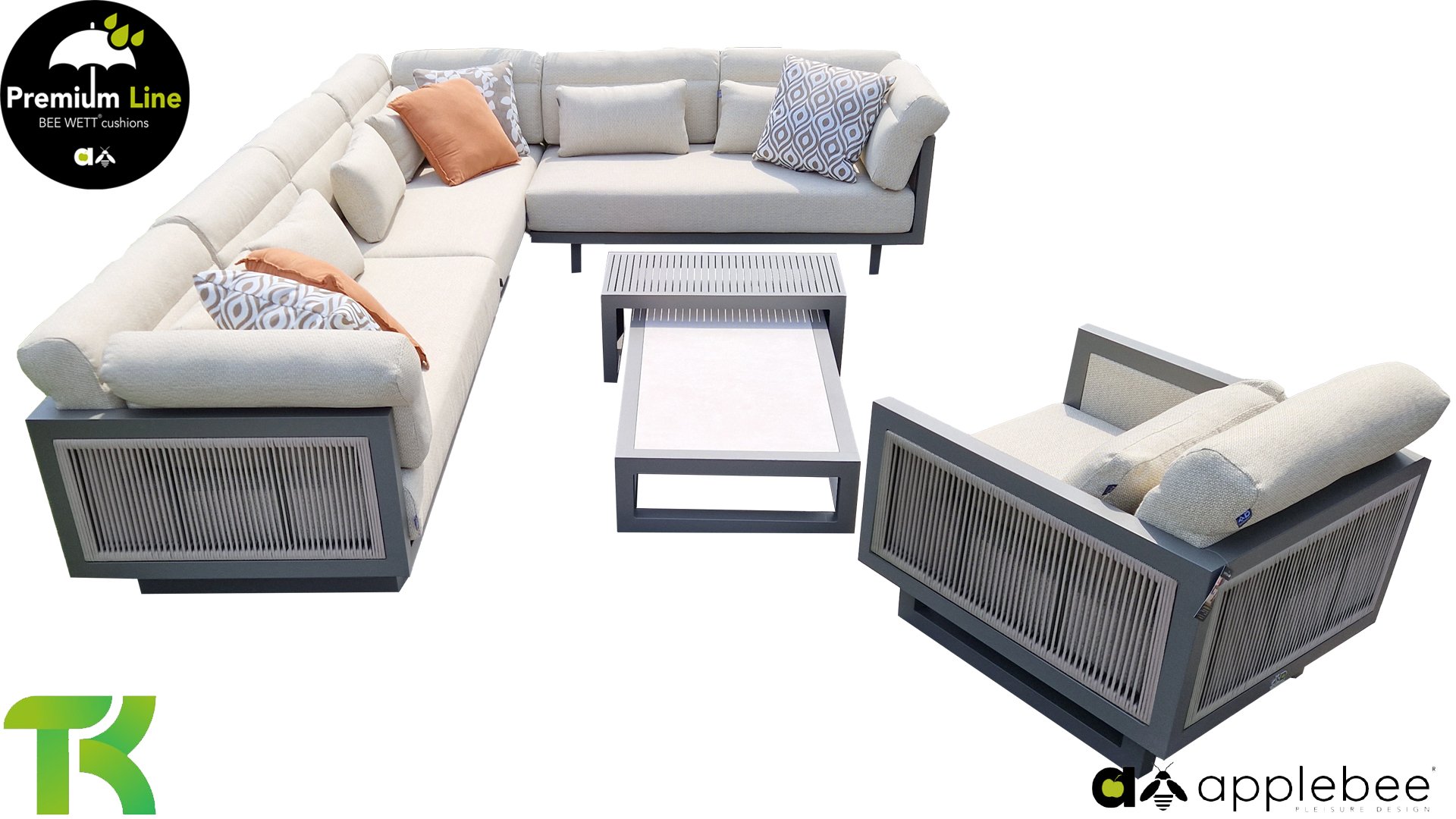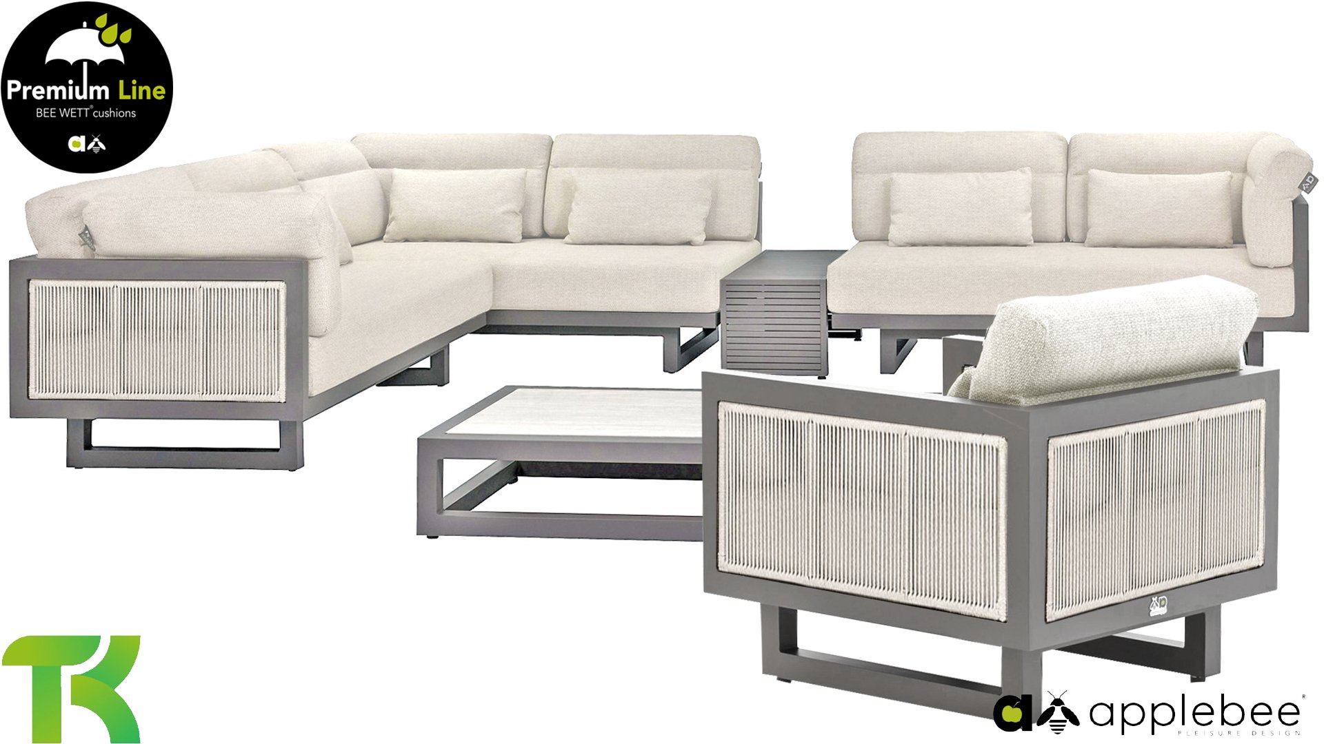 Apple Bee Santorini Lounge Rope: Wenn Sie eine elegante, kubistische Lounge-Garnitur lieben, aber dennoch Wert auf Individualität legen, dann ist die Santorini genau das Richtige für Sie! Ein schlankes, quadratisches Aluminiumrohrgestell, pulverbeschichtet in warmem Taupe. Diese Garnitur ist in zwei Ausführungen erhältlich. Der Unterschied liegt in den Paneelen an Armlehnen und Rückenlehne, die wie ein Gemälde vom Gestell eingerahmt werden. Bei der ersten Ausführung sind die Paneele mit einem wunderschönen, melierten Seil umwickelt. Dies verleiht der Garnitur eine luftige und zugleich moderne Optik. Die zweite Ausführung besticht durch gepolsterte Paneele im gleichen Stoff wie die Kissen und verleiht ihr so ​​einen Hauch von Klasse und Luxus.
