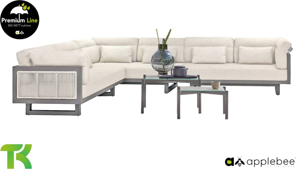 Apple Bee Santorini Lounge Rope: Wenn Sie eine elegante, kubistische Lounge-Garnitur lieben, aber dennoch Wert auf Individualität legen, dann ist die Santorini genau das Richtige für Sie! Ein schlankes, quadratisches Aluminiumrohrgestell, pulverbeschichtet in warmem Taupe. Diese Garnitur ist in zwei Ausführungen erhältlich. Der Unterschied liegt in den Paneelen an Armlehnen und Rückenlehne, die wie ein Gemälde vom Gestell eingerahmt werden. Bei der ersten Ausführung sind die Paneele mit einem wunderschönen, melierten Seil umwickelt. Dies verleiht der Garnitur eine luftige und zugleich moderne Optik. Die zweite Ausführung besticht durch gepolsterte Paneele im gleichen Stoff wie die Kissen und verleiht ihr so einen Hauch von Klasse und Luxus.