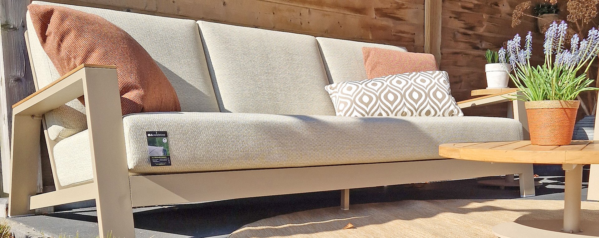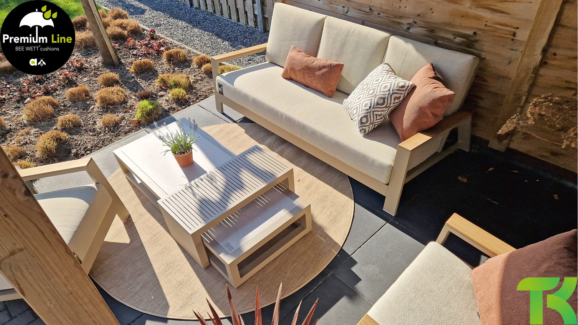 Die Spring-Aluminiumkollektion ist minimalistisch und klar, fällt aber dennoch durch ihr besonderes Design ins Auge. Eine schlanke diagonale Linie, fachmännisch verarbeitetes Aluminium, pulverbeschichtet in einem wunderschönen Latte-Farbton und weiche, bequeme Kissen mit sandfarbener Polsterung. Ein Hauch von Teakholz an der Rückenlehne rundet das Set ab und verleiht ihm das gewisse Extra. Mit einer Dekoration in Ihrem eigenen Stil können Sie diesem „Nest in der Sonne“ im Handumdrehen eine ganz persönliche Note verleihen. Kombinieren Sie das Set mit dem Santorini- oder Emma-Couchtisch oder wählen Sie einen der anderen Apple Bee-Tische. Lass den Frühling kommen!