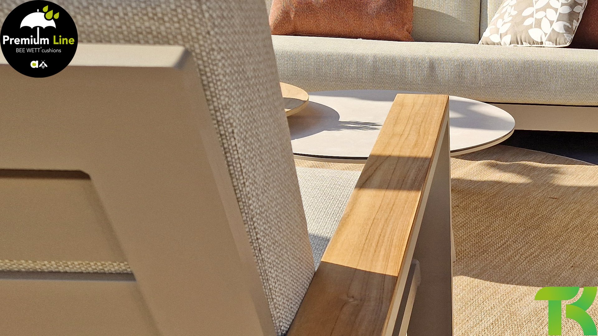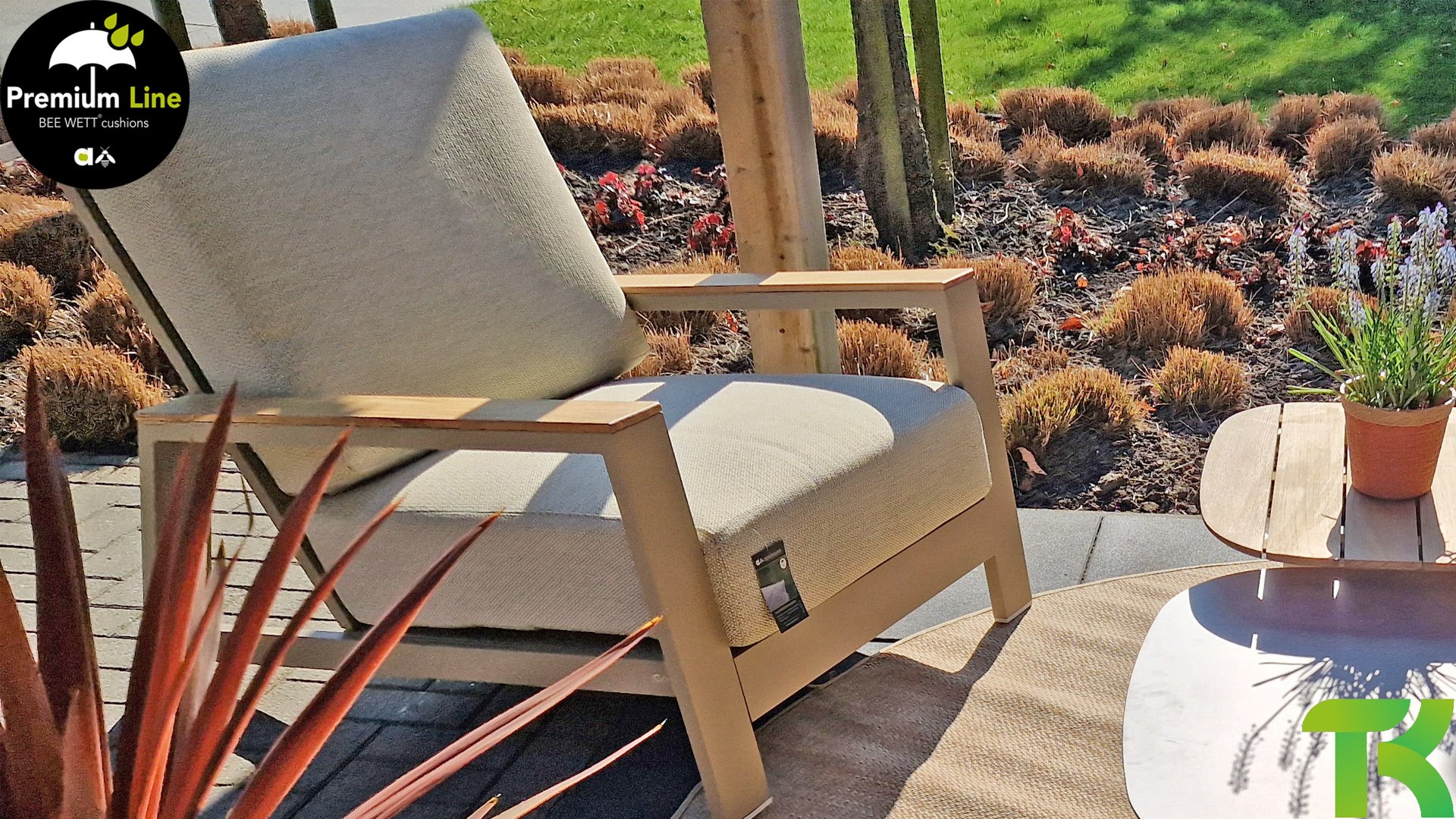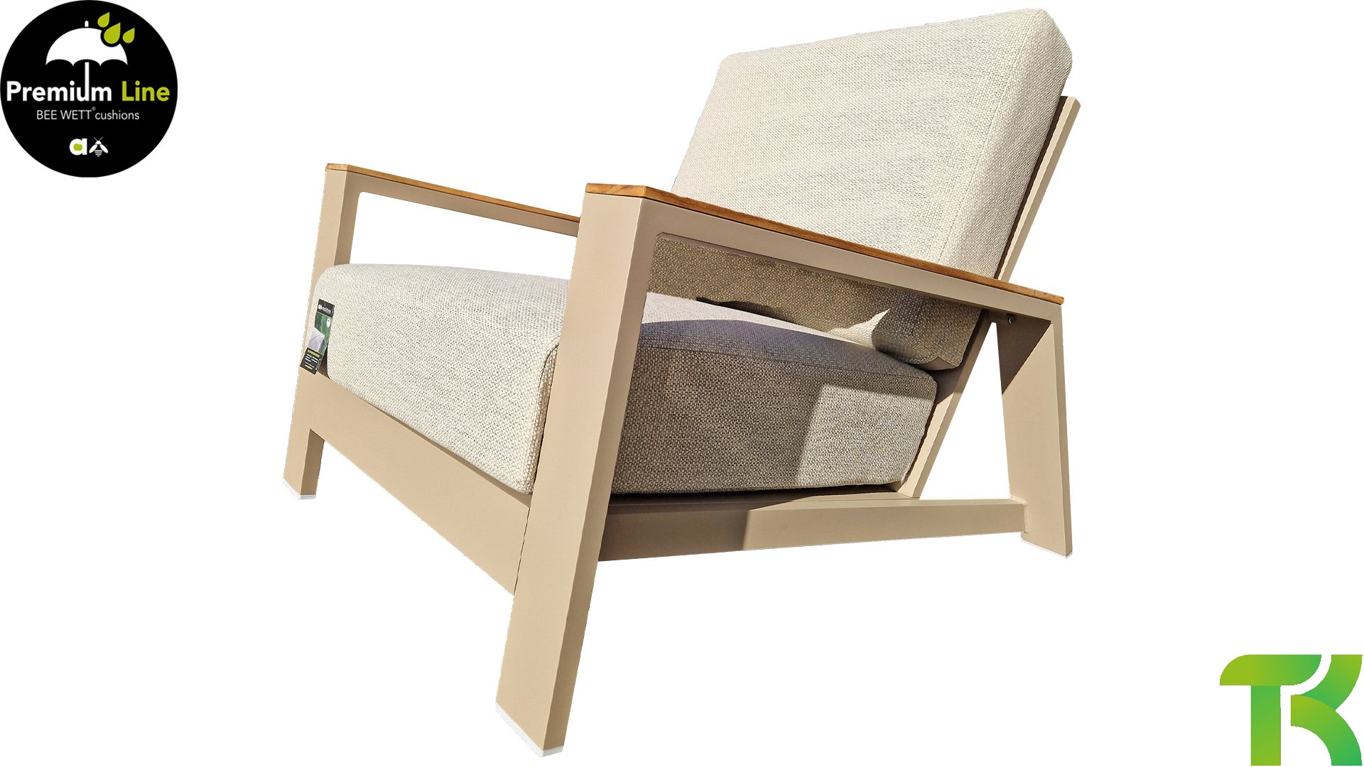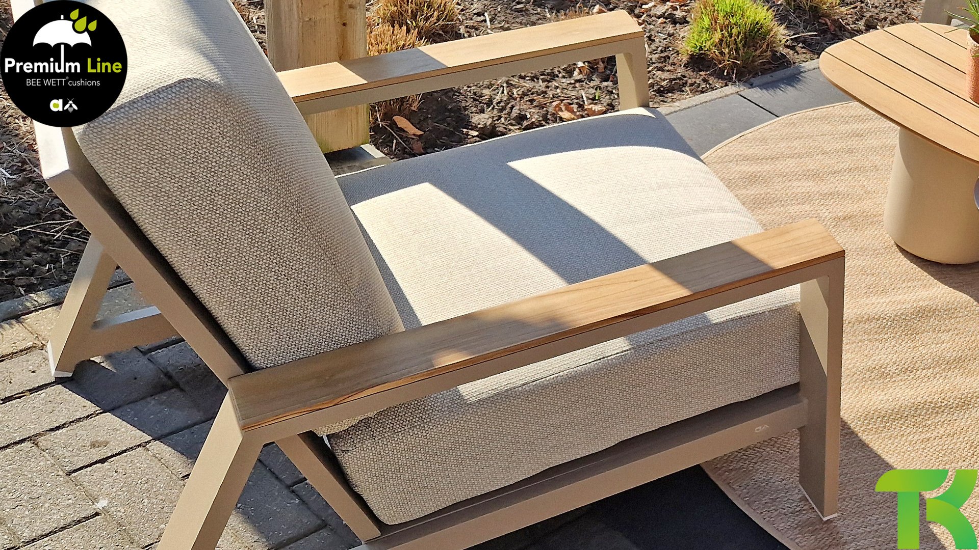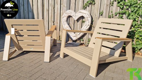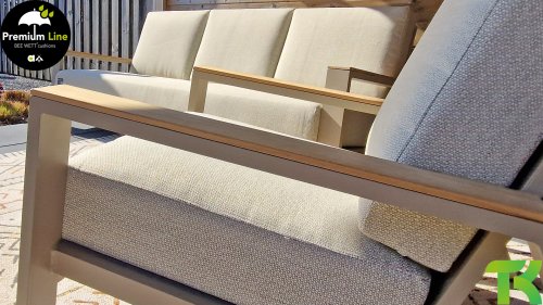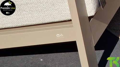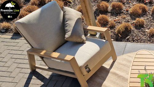 Ein strenges diagonales Linienmuster, sorgfältig verarbeitetes Aluminium, pulverbeschichtet in einer schönen Latte Farbe und weiche, komfortable Kissen in sandfarbenem Stoff. Ein Hauch von Teak auf der Lehne rundet das Set ab und verleiht ihm das gewisse Extra-Detail. Mit einer Dekoration in Ihrem eigenen Stil können Sie im Handumdrehen Ihren eigenen Dreh an diesem 'Sonnennest' geben.