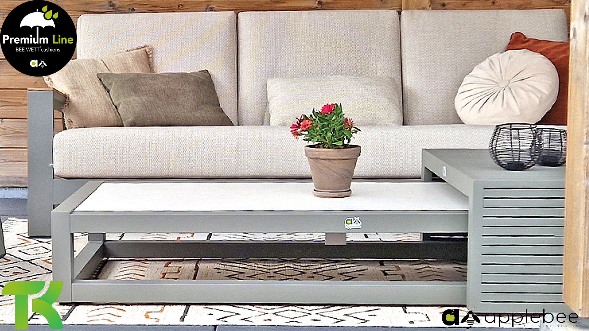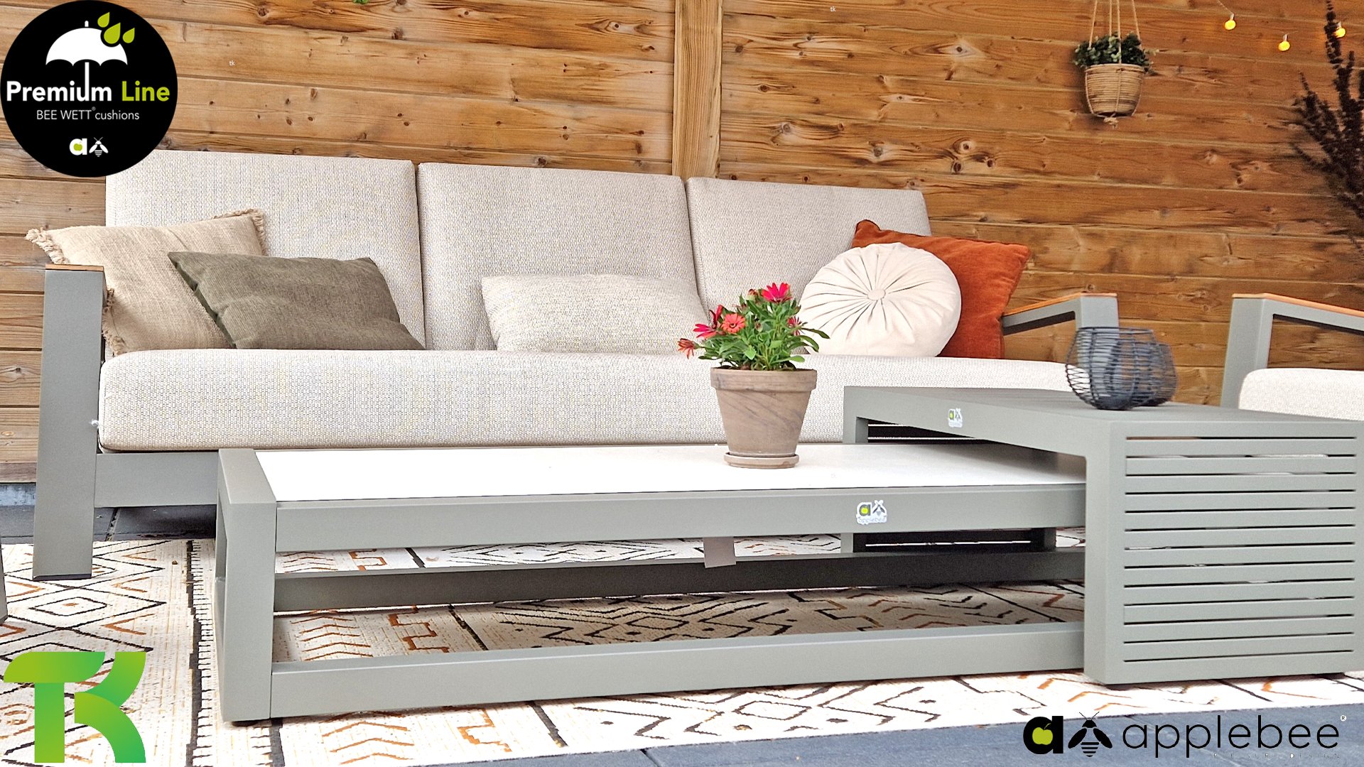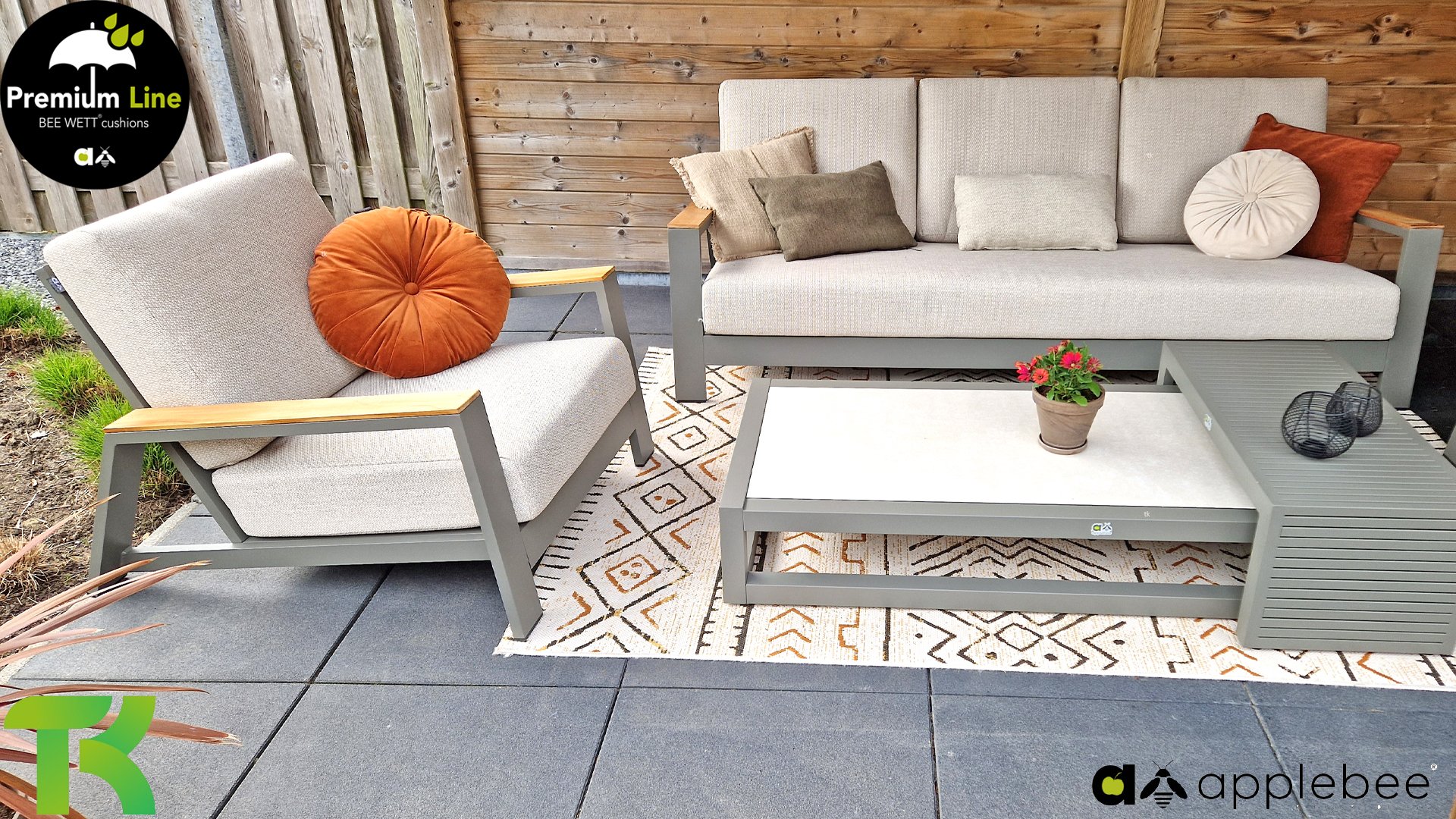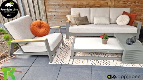 Die Apple Bee Spring Aluminium Taupe Kollektion ist minimalistisch und sauber, aber fällt dennoch durch eine besondere Gestaltung auf. Ein strenges diagonales Linienmuster, sorgfältig verarbeitetes Aluminium, pulverbeschichtet in einer schönen taupe Farbe und weiche, komfortable Kissen in sandfarbenem Stoff. Ein Hauch von Teak auf der Lehne rundet das Set ab und verleiht ihm das gewisse Extra-Detail. Mit einer Dekoration in Ihrem eigenen Stil können Sie im Handumdrehen Ihren eigenen Dreh an diesem 'Sonnennest' geben.