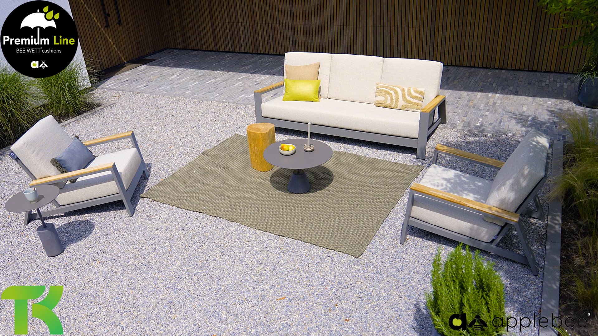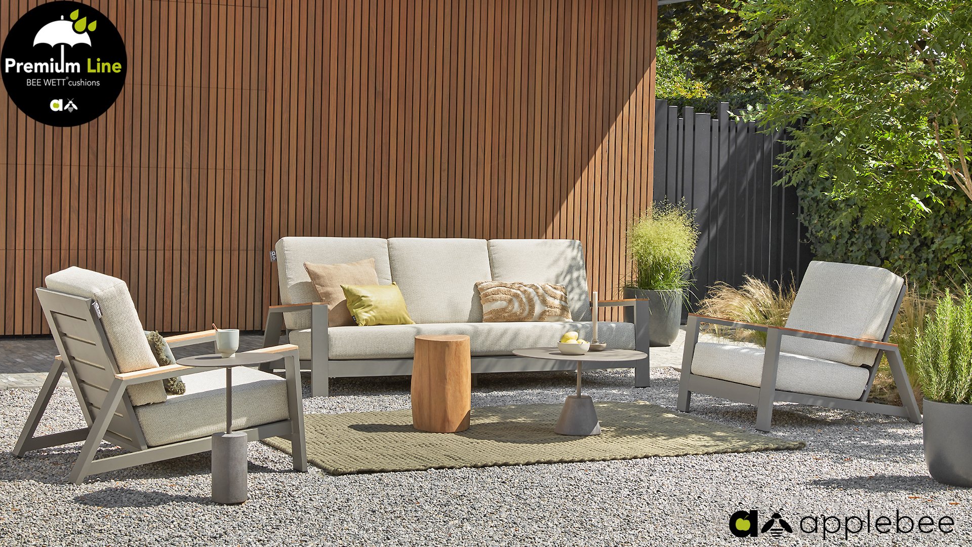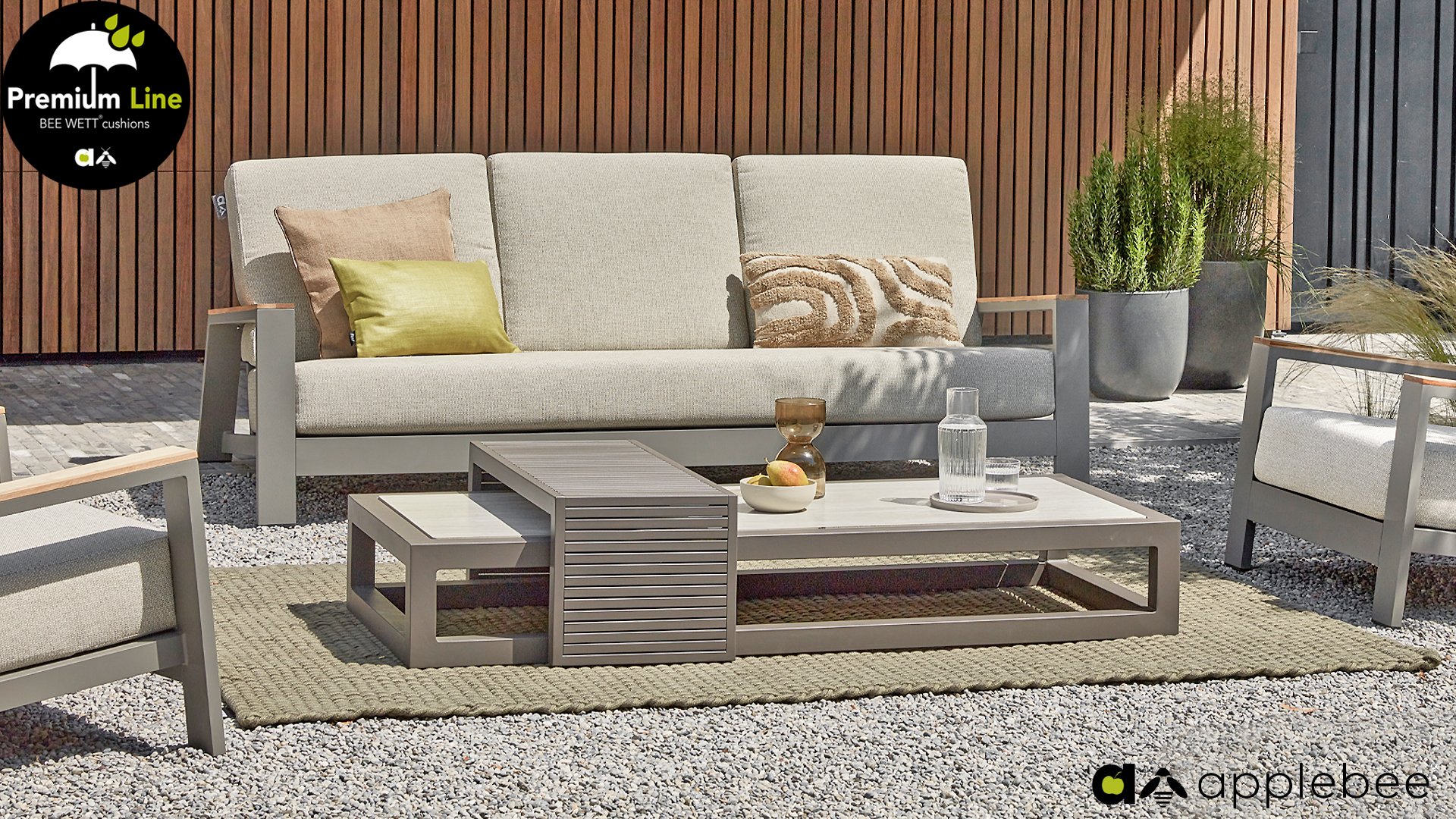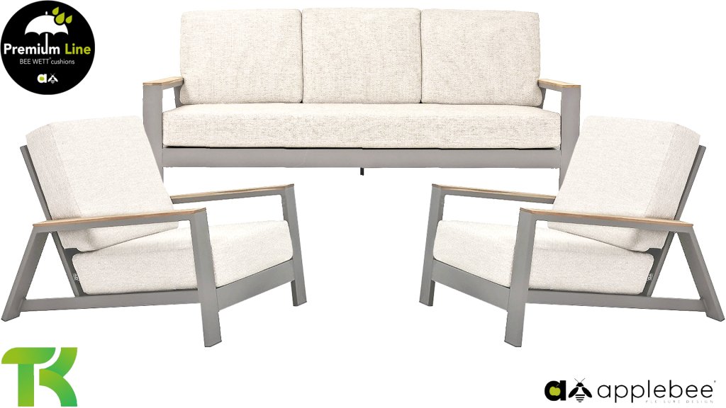 Die Apple Bee Spring Aluminium Taupe Kollektion ist minimalistisch und sauber, aber fällt dennoch durch eine besondere Gestaltung auf. Ein strenges diagonales Linienmuster, sorgfältig verarbeitetes Aluminium, pulverbeschichtet in einer schönen taupe Farbe und weiche, komfortable Kissen in sandfarbenem Stoff. Ein Hauch von Teak auf der Lehne rundet das Set ab und verleiht ihm das gewisse Extra-Detail. Mit einer Dekoration in Ihrem eigenen Stil können Sie im Handumdrehen Ihren eigenen Dreh an diesem 'Sonnennest' geben.