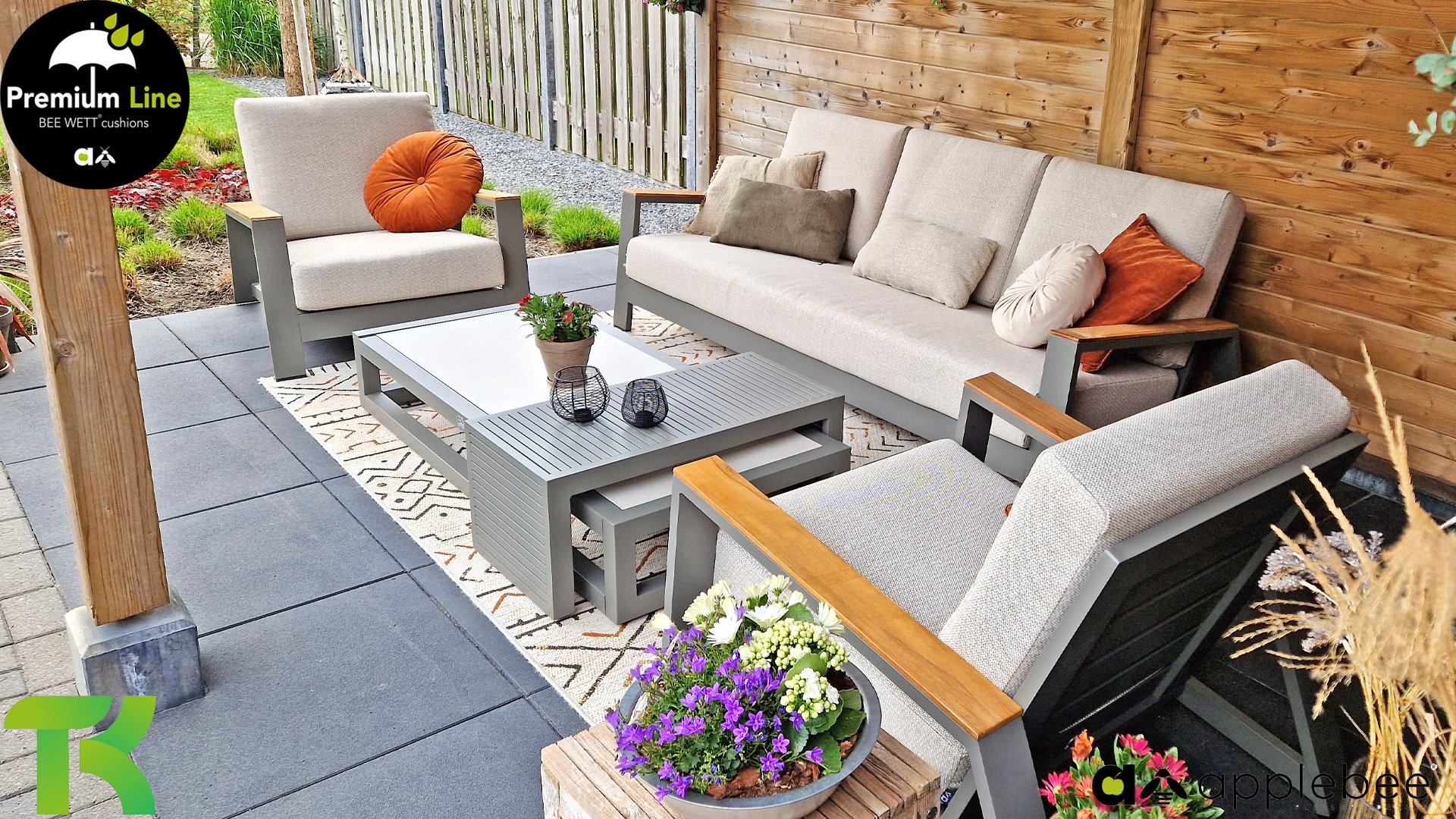 AppleBee Bee Wett sind spezielle wetterfeste Kissen die natürlich draußen liegen bleiben können. Die abnehmbaren Hüllen werden aus den besten möglichen Stoffen hergestellt und sind alle waschbar auf 30°C. Der Stoff ist zusätzlich wasserabstoßend  und garantiert UV-beständig. Eine offenes Gewebe an der Unterseite der Kissen sorgt für eine perfekte Drainage. Der Vorteil, dass die Bee Wett Kissen und Polster unglaublich viel schneller trocknen als vergleichbare andere Kissen. Das Stoff hat eine gute Beständigkeit gegen Verfaulen und Stockflecken und darüber hinaus UV-beständig, weich, komfortabel und feuchtigkeitsabstoßend ist. Die Polster sind ausziehbar und waschbar.