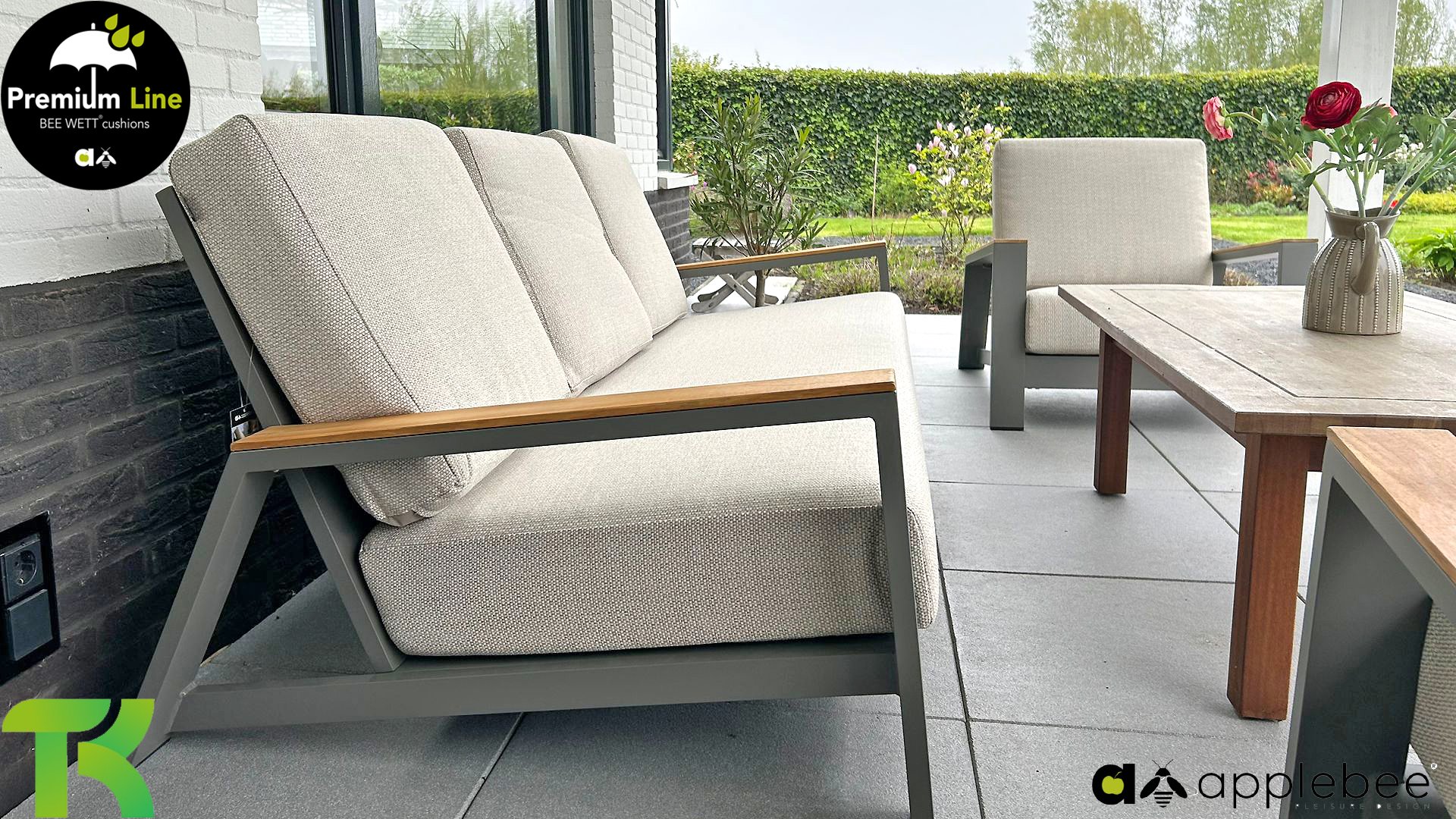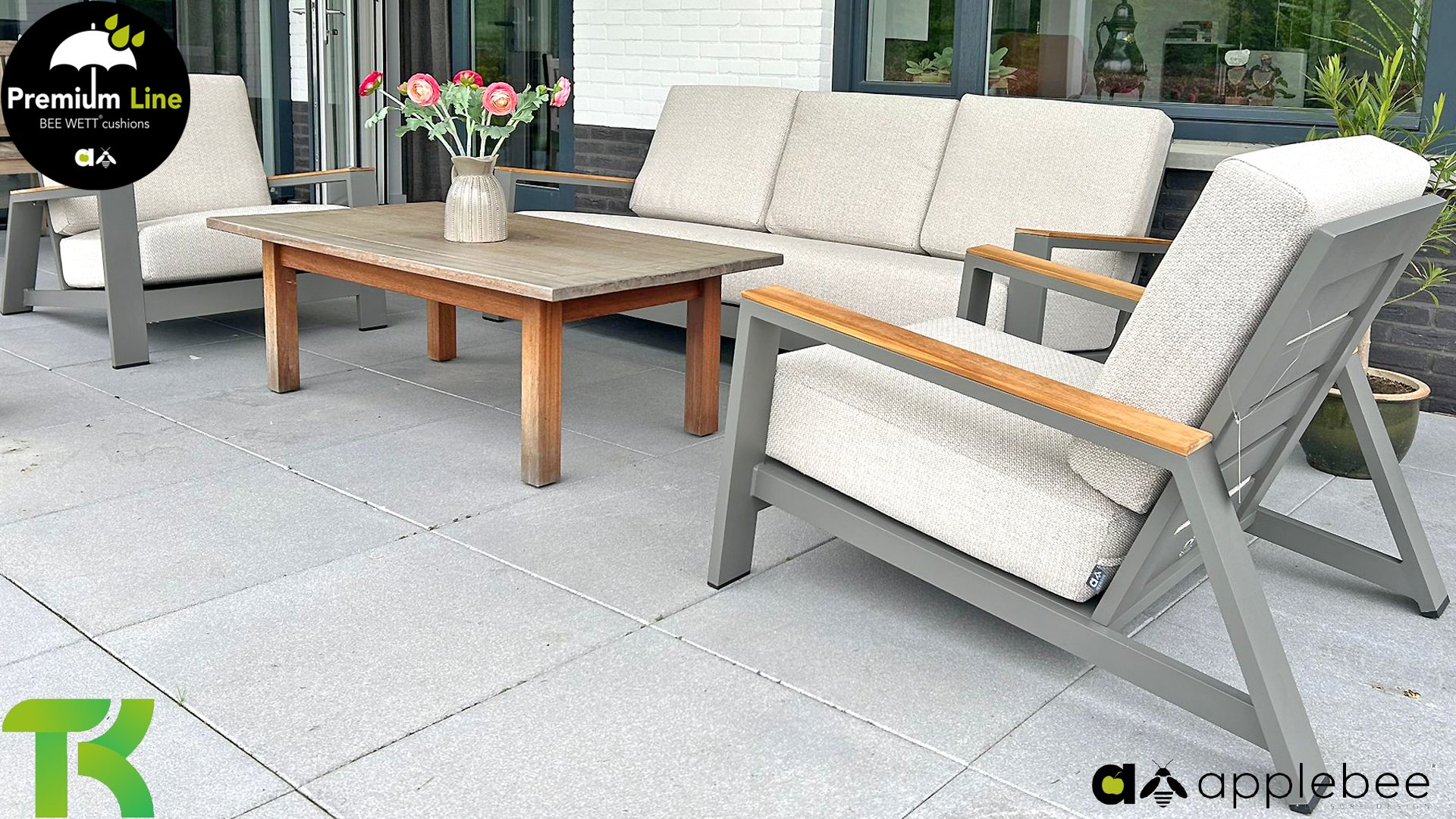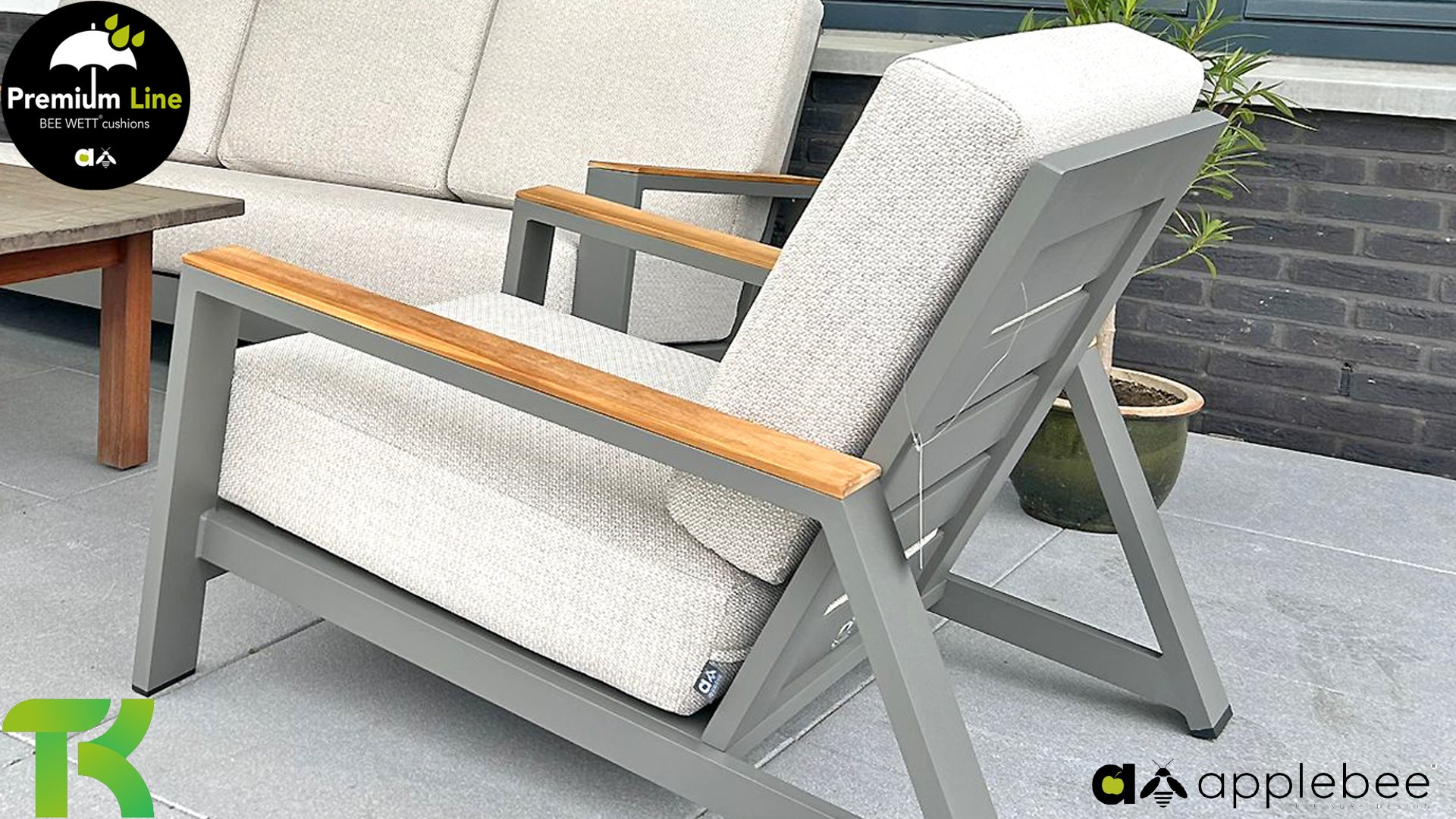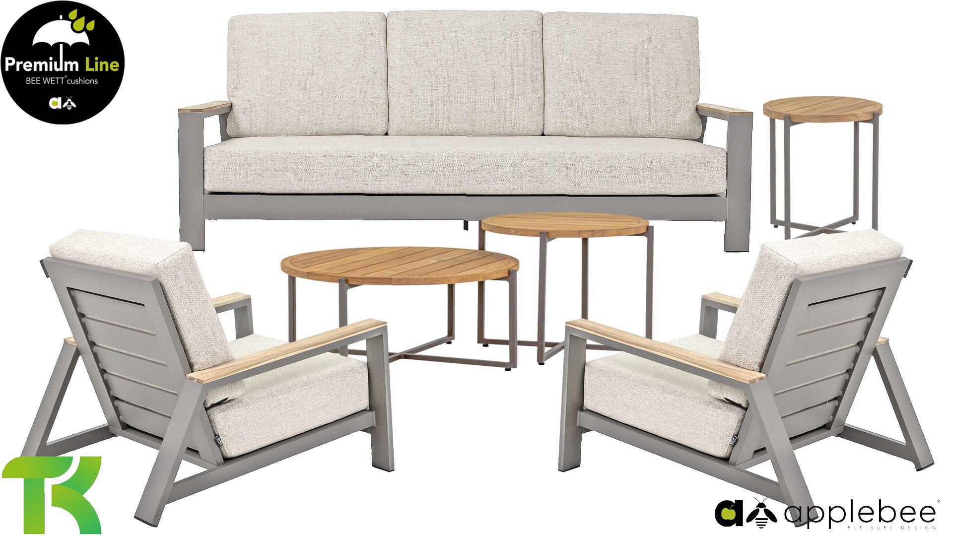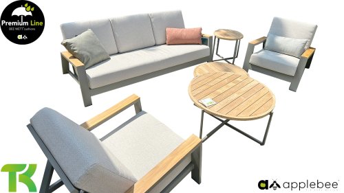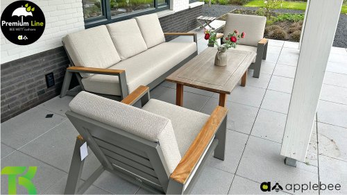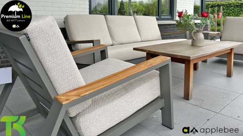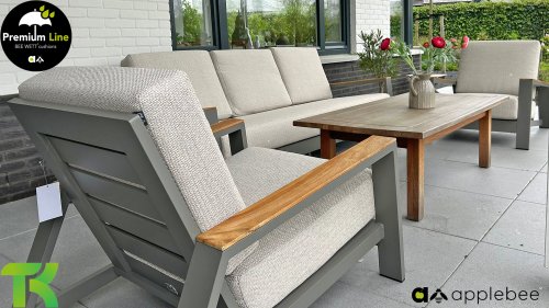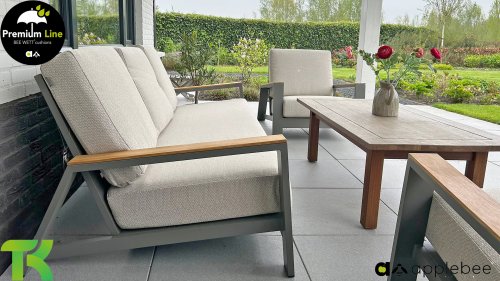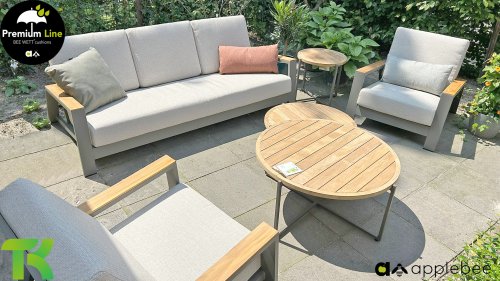 Die Apple Bee Spring Aluminium Taupe Kollektion ist minimalistisch und sauber, aber fällt dennoch durch eine besondere Gestaltung auf. Ein strenges diagonales Linienmuster, sorgfältig verarbeitetes Aluminium, pulverbeschichtet in einer schönen taupe Farbe und weiche, komfortable Kissen in sandfarbenem Stoff. Ein Hauch von Teak auf der Lehne rundet das Set ab und verleiht ihm das gewisse Extra-Detail. Mit einer Dekoration in Ihrem eigenen Stil können Sie im Handumdrehen Ihren eigenen Dreh an diesem 'Sonnennest' geben.