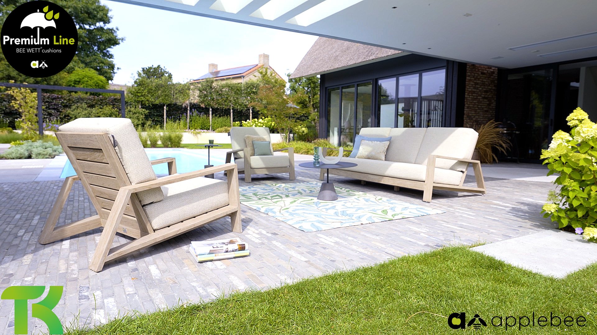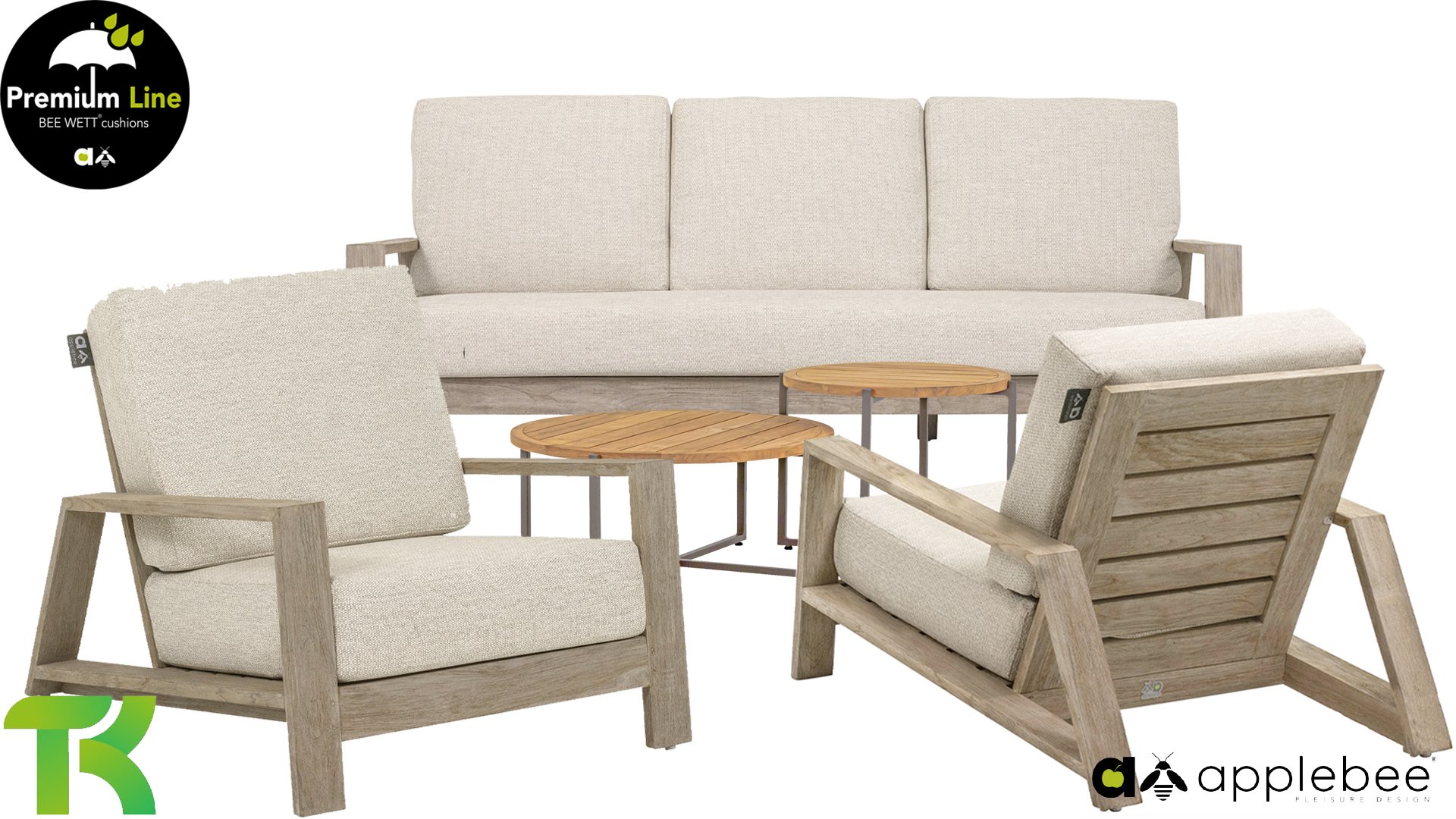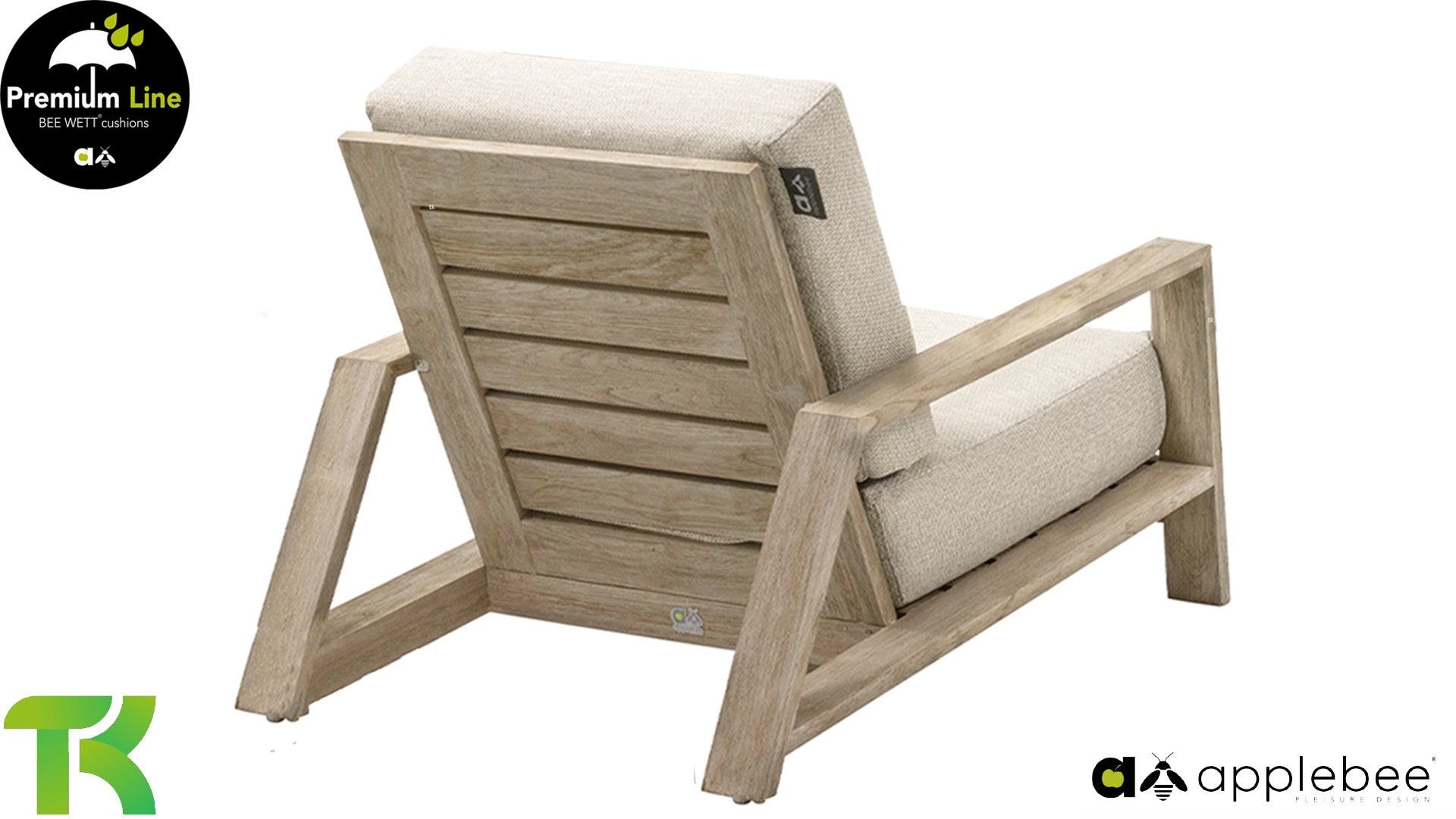 Die Apple Bee Spring Teak-Kollektion besticht durch ihr minimalistisches und klares Design, das dank seiner einzigartigen Formgebung dennoch beeindruckt. Elegante diagonale Linien, handgefertigtes Teakholz in Küstenoptik und weiche, bequeme Kissen mit sandfarbenem Bezug zeichnen dieses Set aus. Gefertigt aus hochwertigem Teakholz, ist es auch ohne Kissen ein wahrer Augenschmaus in Ihrem Garten. Ein harmonisches Gesamtbild! Mit ein paar schönen Dekokissen nach Ihrem Geschmack schaffen Sie im Handumdrehen Ihre ganz persönliche Wohlfühloase in der Sonne.