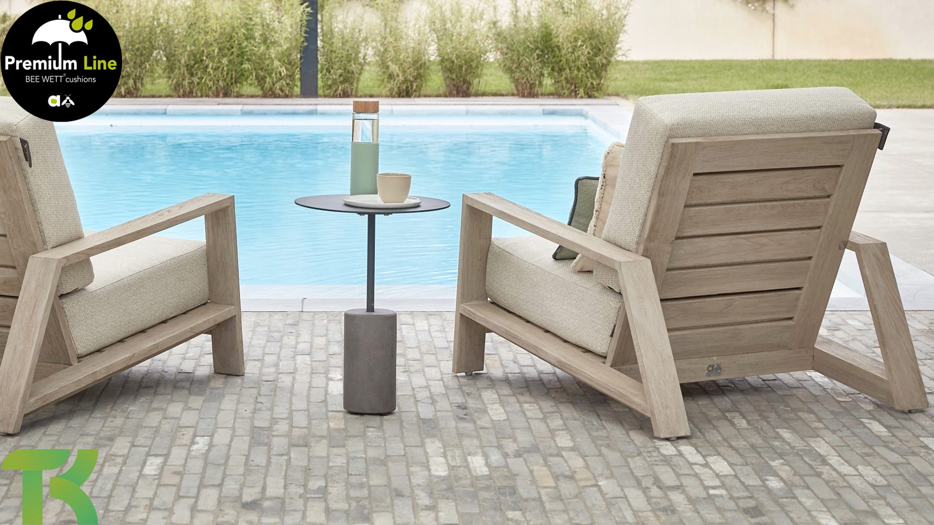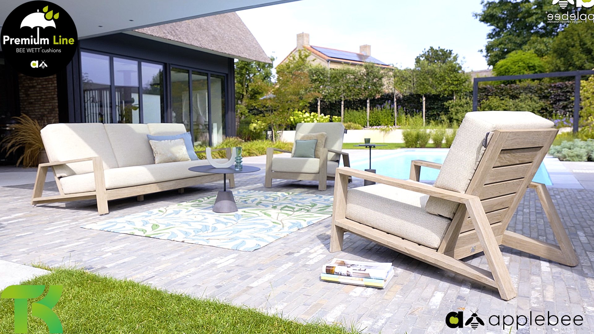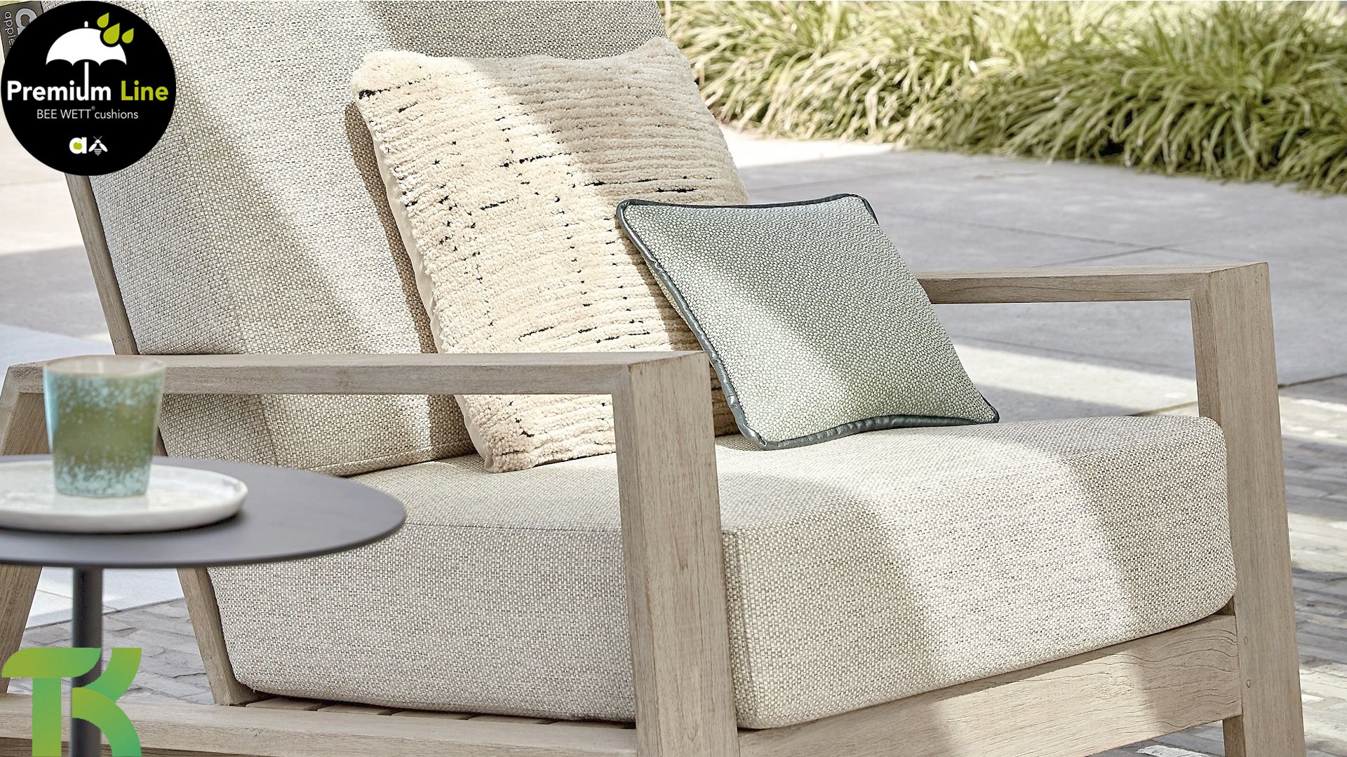 Die Apple Bee Spring Teak-Kollektion besticht durch ihr minimalistisches und klares Design, das dank seiner einzigartigen Formgebung dennoch beeindruckt. Elegante diagonale Linien, handgefertigtes Teakholz in Küstenoptik und weiche, bequeme Kissen mit sandfarbenem Bezug zeichnen dieses Set aus. Gefertigt aus hochwertigem Teakholz, ist es auch ohne Kissen ein wahrer Augenschmaus in Ihrem Garten. Ein harmonisches Gesamtbild! Mit ein paar schönen Dekokissen nach Ihrem Geschmack schaffen Sie im Handumdrehen Ihre ganz persönliche Wohlfühloase in der Sonne.