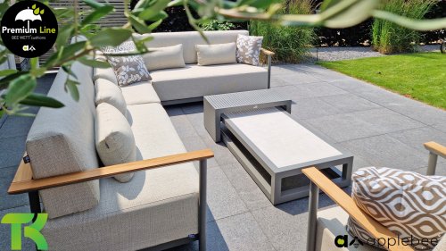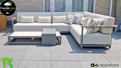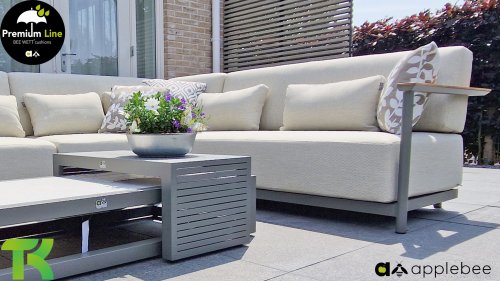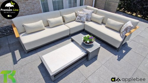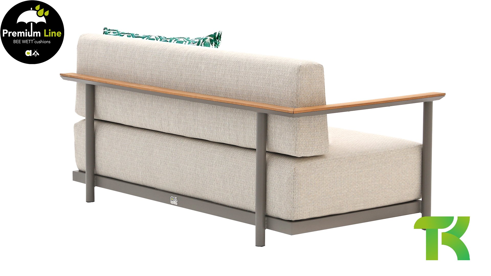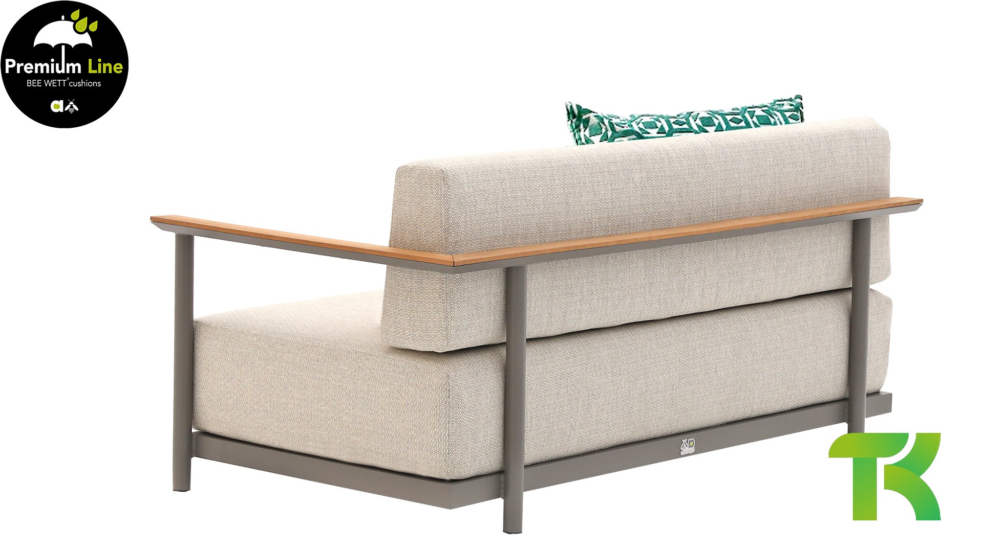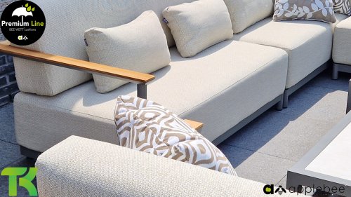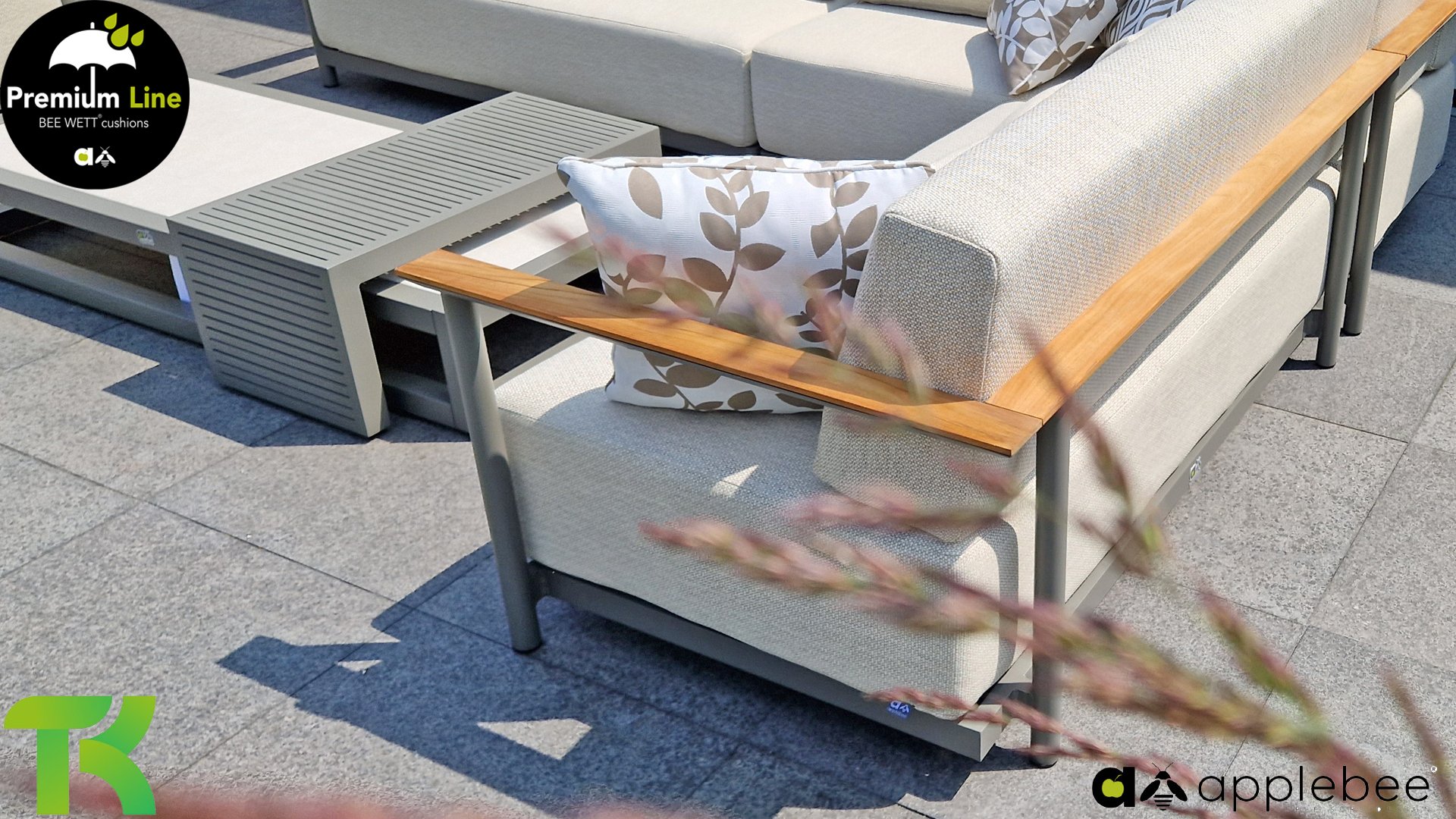 Mit dem Apple Bee St. Lucia Aluminium Lounge sitzen Sie nicht nur bequem, sondern auch komfortabel: Die Kissen sind satte 25 cm dick! Diese extra dicken Kissen verleihen dem St. Lucia einen luxuriösen Look. Das taupefarbene (Quarz-)Aluminiumgestell besticht durch formschöne runde Beine und eine durchgehende Arm- und Rückenlehne. Als besonderes Detail ziert die Oberseite der Armlehne eine Zierleiste aus naturbelassenem SVLK-Teakholz – ein markantes Detail, typisch für dieses Apple Bee Design.