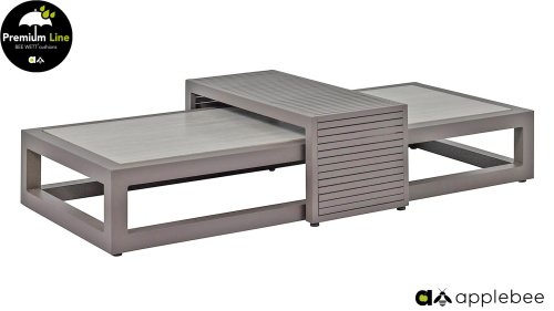 Das Apple Bee Santorini Kaffeetisch-Gruppe, dessen Basis aus Aluminium in der Farbe Quarz besteht. Die Platte des 155 cm langen Tisches ist aus Keramik in der Farbe Travetino. Eine elegante Kombination, besonders mit dem Apple Bee Santorini Lounge!