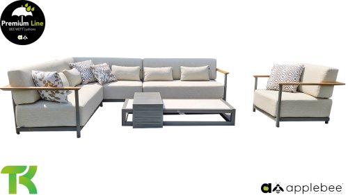 Mit dem Apple Bee St. Lucia Aluminium Lounge sitzen Sie nicht nur bequem, sondern auch komfortabel: Die Kissen sind satte 25 cm dick! Diese extra dicken Kissen verleihen dem St. Lucia einen luxuriösen Look. Das taupefarbene (Quarz-)Aluminiumgestell besticht durch formschöne runde Beine und eine durchgehende Arm- und Rückenlehne. Als besonderes Detail ziert die Oberseite der Armlehne eine Zierleiste aus naturbelassenem SVLK-Teakholz – ein markantes Detail, typisch für dieses Apple Bee Design.