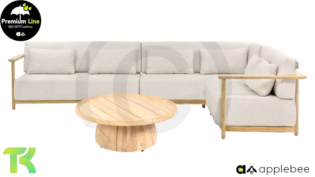 Apple Bee St. Lucia Teak Lounge: Wie luxuriös möchten Sie die Kissen Ihrer Loungeset haben? Die St. Lucia Teak Lounge hat Sitzkissen von beeindruckenden 25 cm Dicke, natürlich in der Apple Bee Bee Wett Qualität. Trotzdem, dass Sie es vielleicht nicht erwarten, trocknen diese Kissen auch wesentlich schneller als Kissen mit Standardschaum. Durch die extrem dicken Kissen erhält die St. Lucia sofort ein sehr luxuriöses Aussehen, bleibt aber durch die klare Form und Stabilität zeitgemäß. Dies liegt natürlich auch am Rahmen aus hochwertigem SVLK-Teakholz in natürlicher Farbe. Die runden Beine gehen elegant in eine geschmackvoll geformte Lehne über, die von der Armlehne über den Rücken verläuft und Sie sozusagen umarmt. St. Lucia ist robust und gleichzeitig raffiniert in den richtigen Proportionen!