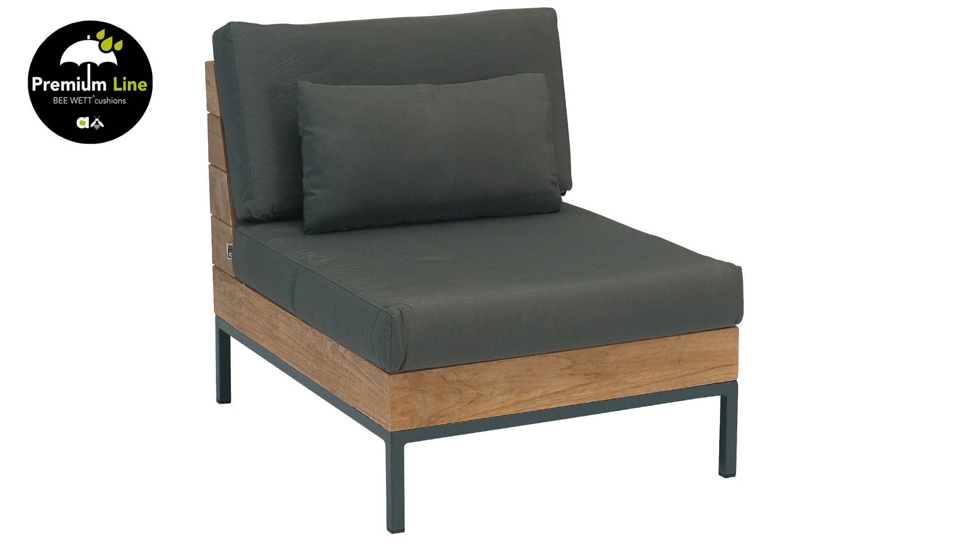 Der schlanke Aluminiumrahmen an der Unterseite des Loungesets sorgt für einen Kontrast zu dem robusten Oberteil. Die dunkelgrauen Bee Wett-Kissen runden das Gesamtbild ab.