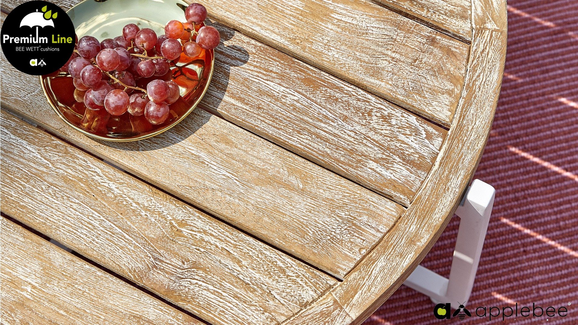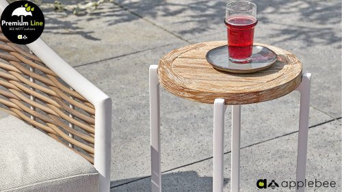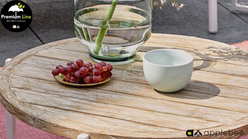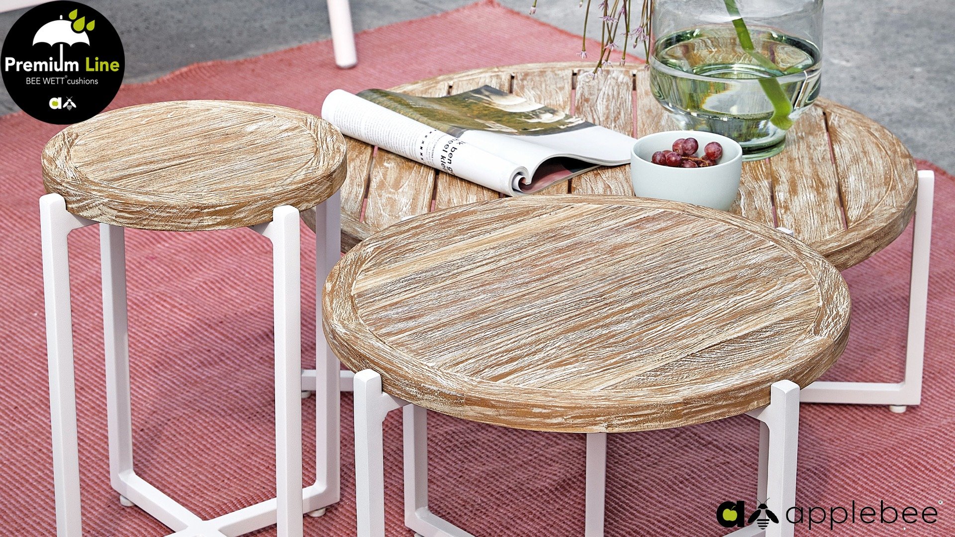 Die Milou-Couchtische bestehen aus 3 Größen: 34, 54, 74 Zentimeter Durchmesser. Die Höhen variieren, wodurch diese Tischchen auch sehr gut als Set kombiniert werden können. Das Teakholz ist weiß gewaschen und das Gestell ist pulverbeschichtetes Aluminium. Wartungsfrei also.