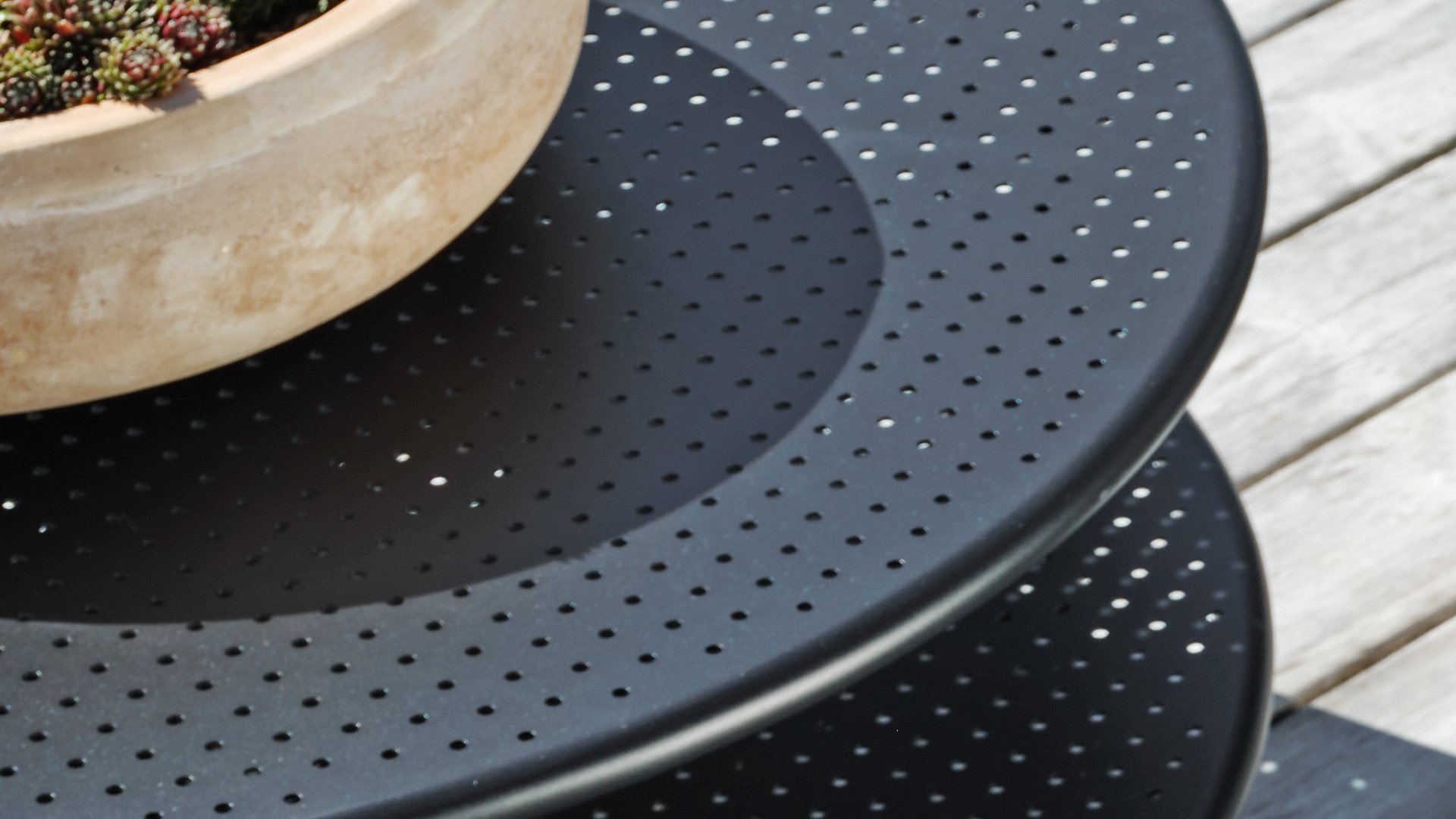 Der runde Couchtisch Blixt ist in zwei Höhen und Größen erhältlich: eine höhere (42 cm) mit einem Durchmesser von 65 cm und eine niedrigere (39 cm) mit einem Durchmesser von 85 cm. Die beiden runden Metallplatten auf unterschiedlichen Ebenen sind perforiert – ein schönes und praktisches Detail. Erhältlich in mattem Schwarz und Weiß. Platzieren Sie sie einzeln oder paarweise – sie können sich dank des geringen Höhenunterschieds teilweise überlappen.