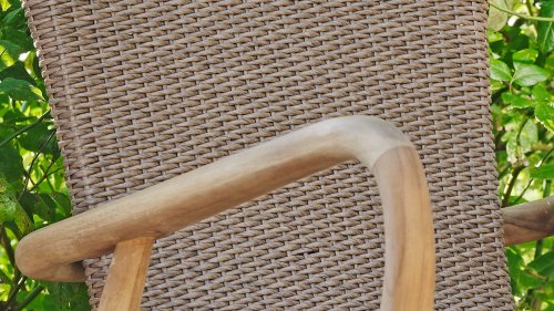 Lehnen Sie sich zurück und entspannen Sie sich in diesem herrlichen Lilija Lounge-Sessel. Die Armlehnen aus Teakholz sind ein echter Blickfang. Die Sitzfläche besteht entweder aus stilvollen breiten Teakholzrippen oder aus geflochtenem synthetischem Rattan. die Brafab Lilja wurde sowohl zum Entspannen als auch zum Essen geschaffen, mit organischen runden Formen aus Teakholz. Substanzielle Elemente vermitteln mit ihren geschwungenen Details Eleganz.
