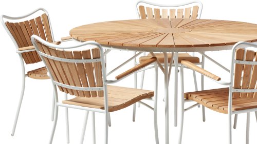 Die schönen CINAS Ellen-Tische haben eine einzigartige Teakholzplatte in Form von Sonnenstrahlen, wenn Ihnen das nicht warm wird! Tische sind erhältlich in Ø110cm, Ø130cm, Ø150cm. Diese Tische sind auch klappbar, was einfach und platzsparend zu verstauen ist. Es gibt auch den Bistrotisch Ellen Ø80cm.
