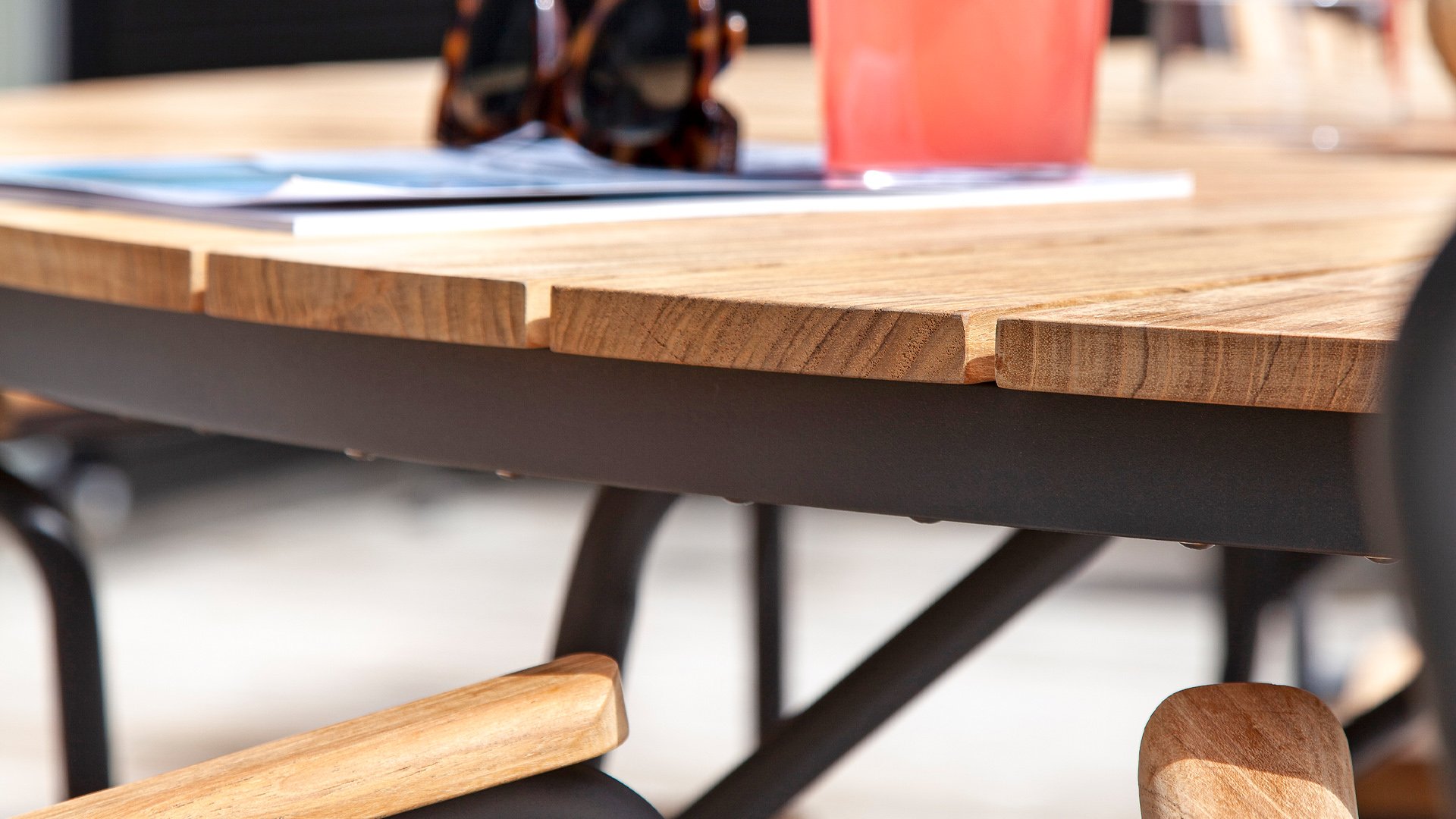 Gartenmöbel aus Teakholz bieten einen atemberaubenden Blick.Teakholz eignet sich besonders gut für den Einsatz im Außenbereich. Es ist resistent gegen Schädlinge und Pilze und widerstandsfähig gegen Sonne, Regen und Schnee. Mit der Zeit entwickelt das Teakholz eine silbergraue Patina. Gartenmöbel aus Teakholz bieten einen atemberaubenden Blick. Darüber hinaus ist es starkes Material und erfordert nur wenig Wartung. Wer die ursprüngliche Farbe des Teakholzes bevorzugt, kann durch regelmäßiges benutzen unser Pflegemittel ganz einfach das Vergrauen des Holzes verhindern.Darüber hinaus können Sie Teak mit grüner Seife reinigen. Durch Temperaturunterschiede und durch den Wechsel von Feuchtigkeit und Trockenheit können kleine Haarrisse entstehen. Es ist üblich, dass Man in dies Unvollkommenheiten findet, diese Unregelmäßigkeiten sind kennzeichnend für dieses Produkt. Diese Unregelmäßigkeiten können nie einen Anlass zu Reklamation, Garantie oder Claim formen. Es betrifft eine Unterschrift von Originalität!  Wir gewähren Garantie auf alle Produktions- und Konstruktionsfehler. Die Wirkung von Teakholz ist nicht enthalten. Wenn Sie sich für Teakholz entscheiden, erwarten wir, dass Sie diese Eigenschaften zu schätzen wissen. Eventuell auftretende Haarrisse, Äste im Teakholz und raue Oberflächen im Laufe der Zeit fallen nicht unter unsere Garantie. Diese Eigenschaften verleihen dem Teakholz seinen eigenen Charakter und sind Teil der Optik. Seien Sie vorsichtig mit einem Blumentopf oder einer Vase auf Ihrem Gartentisch aus Teakholz, da dies zu hartnäckigen Kreisen oder Farbunterschieden führen kann.