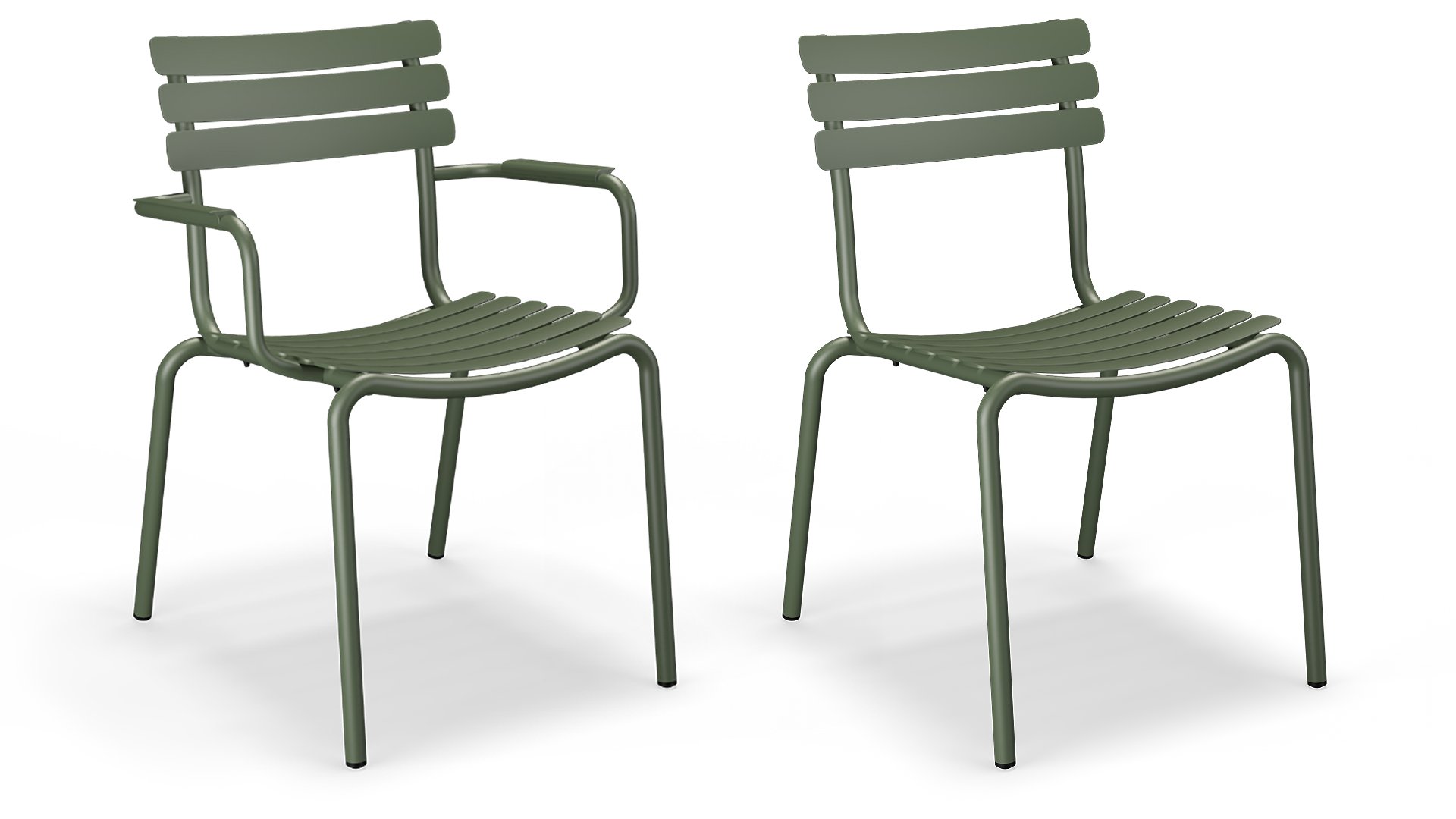 ALUA ist in 6 Farben erhältlich: Muted White / Black / Beige / Cayenne / Ice Blue / Olive Green und bietet die Wahl zwischen Modellen mit oder ohne Armlehnen. Konzipiert für einfaches Stapeln, kann bis zu 10 Stück gestapelt werden. Die gebogenen Aluminiumlamellen sind so geformt, dass Sie ein angenehmes Sitzgefühl erhalten und dem Stuhl ein weiches und einladendes Aussehen verleihen.